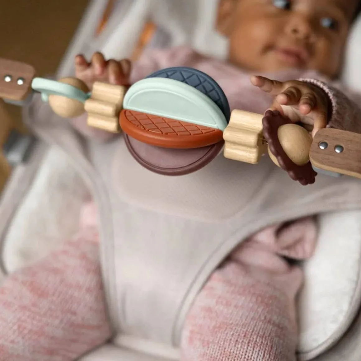 UPPAbaby’s Mira Bouncer Toy Bar is designed for use with the Mira Bouncer and offers a chance for the child to be engaged practice their skills. Choose between adorable animals that spin, squeak, jingle, and crinkle to stimulate visual and auditory senses, and colorful textured wood shapes that spin and slide, encouraging fine motor development and hand-eye coordination. The UPPAbaby Mira Bouncer Toy Bar easily attaches to the bouncer and folds with it as well.