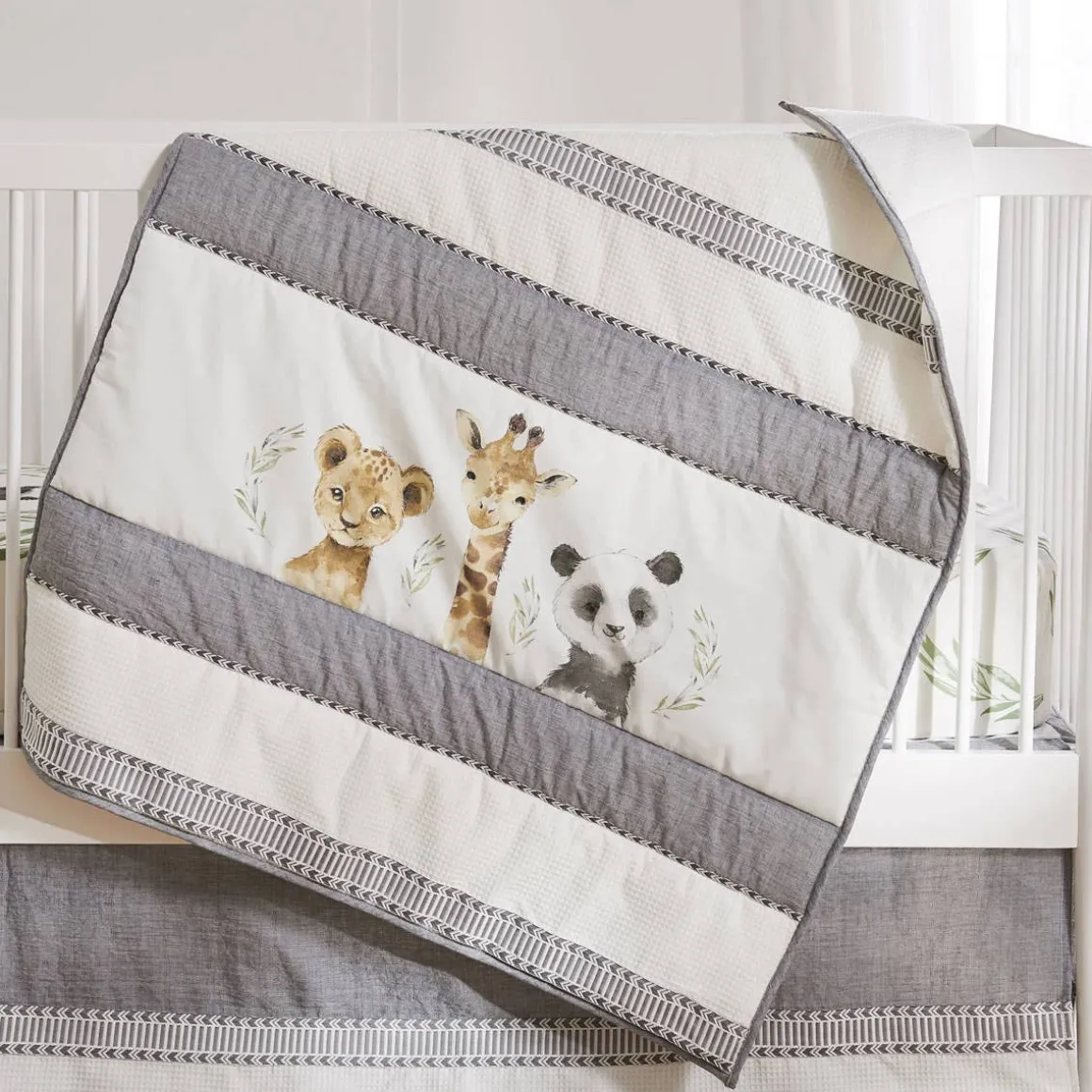 You will think you are in a fantastic jungle adventure with this adorable jungle babies look. The fitted sheet is tossed baby elephants, giraffes, pandas, koalas and lion cubs on a white ground, or switch it out with the one featuring . The quilt features printed curious lion cub, baby giraffe and panda with appliqued grey, cream and herringbone. The bed skirt has a handsome grey fabric edged in a grey herringbone and textured cream bottom, while the large nursery wall decal depicts an adorable jungle scene with self-stick, reusable decals featuring leaves , a trio of baby animals and the words LOVE THEM BUT LET THEM BE WILD, completing your adorable jungle babies nursery look.