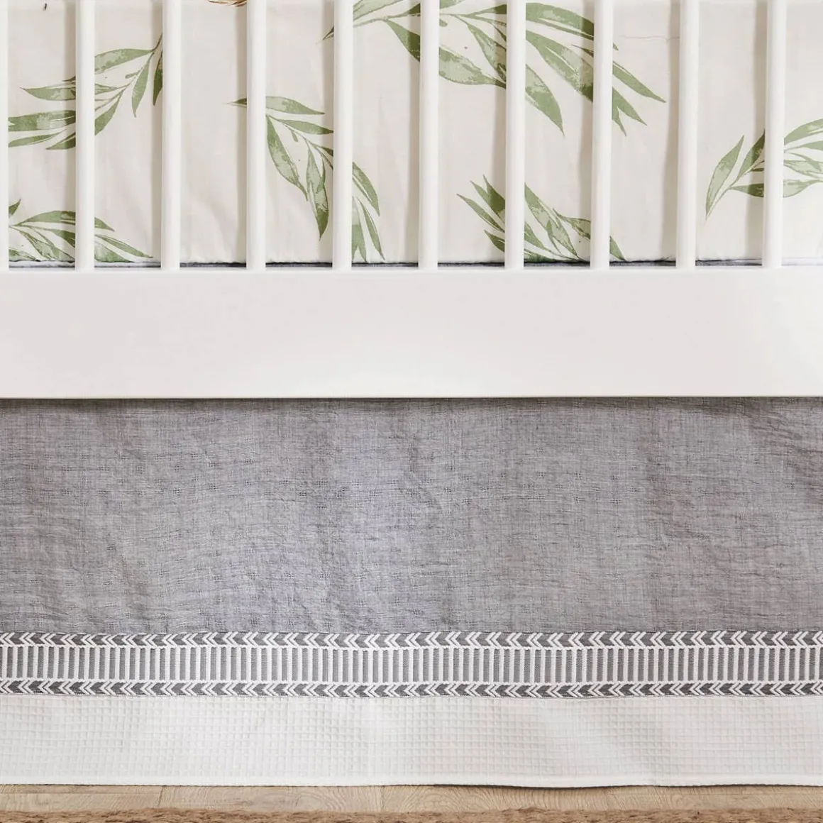 The Mozambique nursery set is 100% cotton (not including decoration) and features 4 beautifully coordinated and complementary pieces, consisting of a quilt, one 100% cotton fitted sheet, a decorative tailored dust ruffle and a large decorative wall decal.