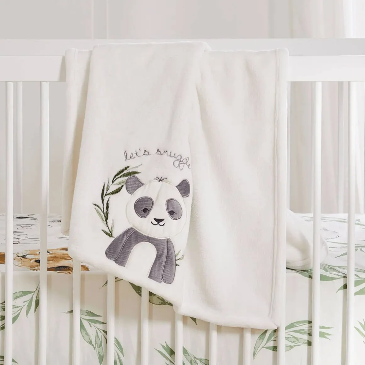 Wrap your baby up in warmth and comfort with the Levtex Baby Mozambique Blanket. Made of an adorable soft grey plush fabric , this blanket features an appliqued and embroidered panda cub with leaves on a soft plush, cream ground and the words LETS SNUGGLE embroidered above This plush blanket measures 30 x 40in. and is machine washable for easy maintenance.