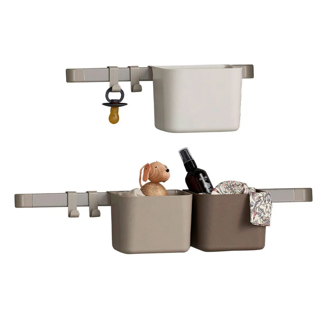 Keep your child’s room beautifully organized with this clever storage system from Leander in stylish colors. The set consists of a short and a long rail for the wall, three removable Organizers and 4 hooks. Screws and dowels are not included. The storage system helps you to keep your nursery essentials beautifully organized and easily accessible such as nappies, bodysuits, and pacifiers.