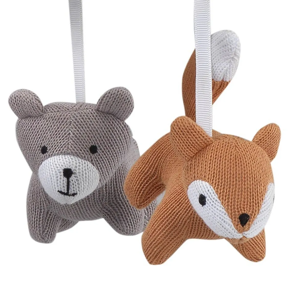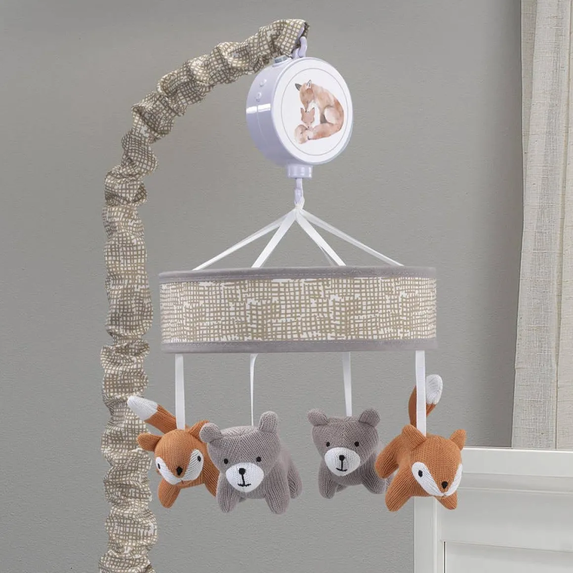 Complete this charming collection with a coordinating musical mobile. Four sweet knitted animals, two foxes and two bears, rotate around a decorative ring while playing Brahms Lullaby, Twinkle Twinkle Little Star, and Rock-A-Bye Baby. Mobile plays for 20 minutes, has an on/off switch and volume control. Mobiles should be placed out of arms reach of your baby. Requires 3 AAA batteries not included. Imported.