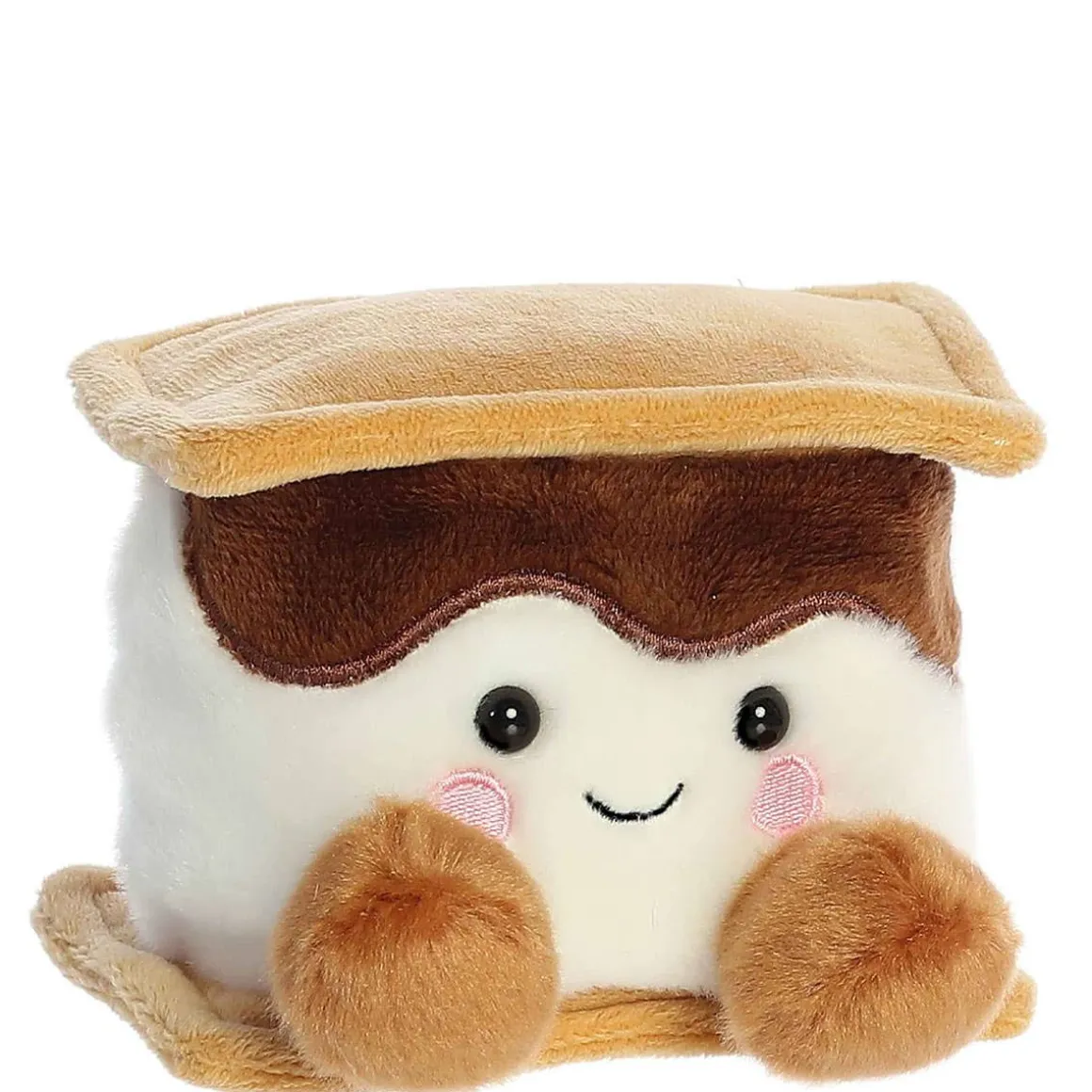 Toastee S’more is a plush toy that resembles a s’more with a toasted top and bottom layer, filled with rich chocolate and fluffy marshmallow in between. It has a cute, smiling face with rosy cheeks and two soft plush hands, perfect for giving warm hugs.