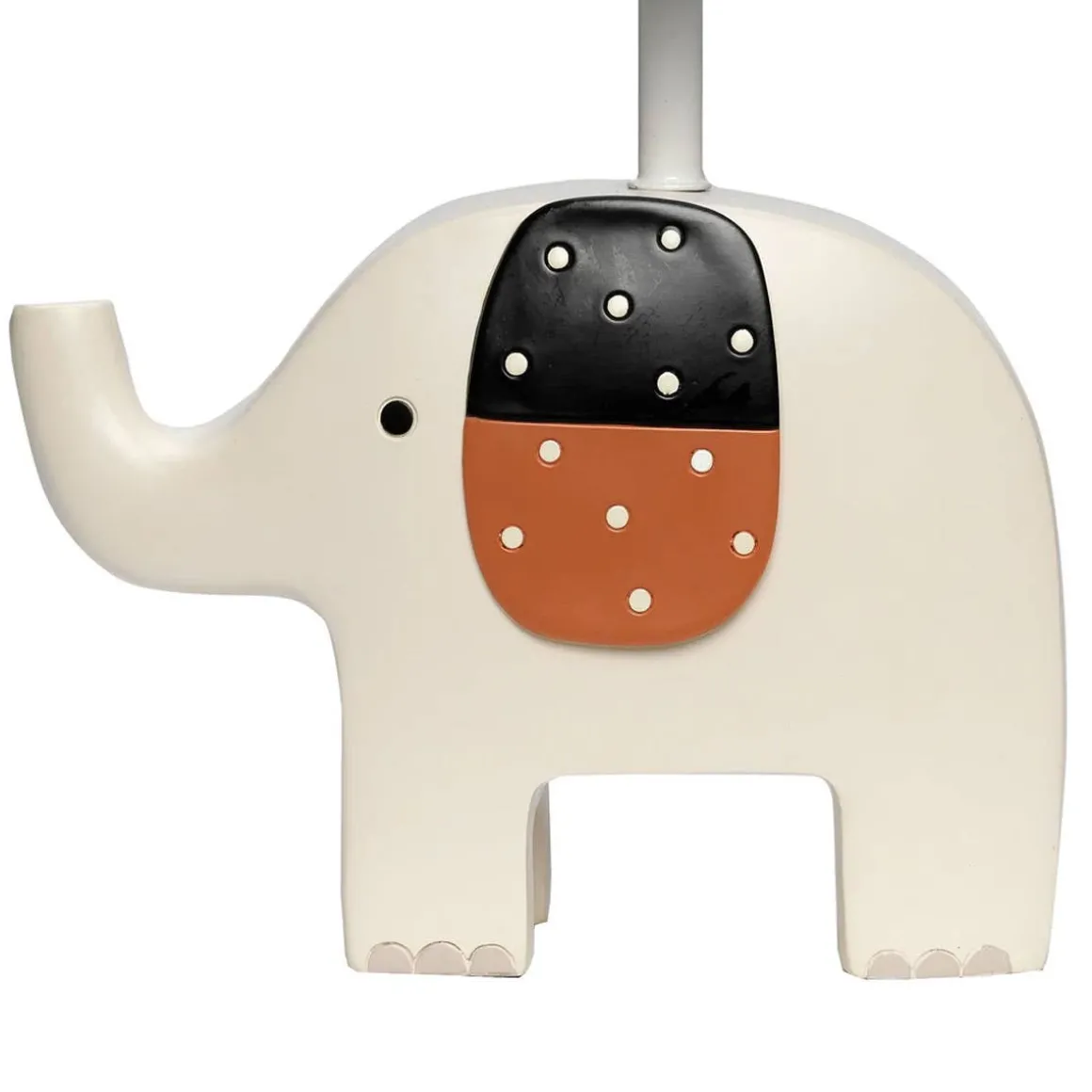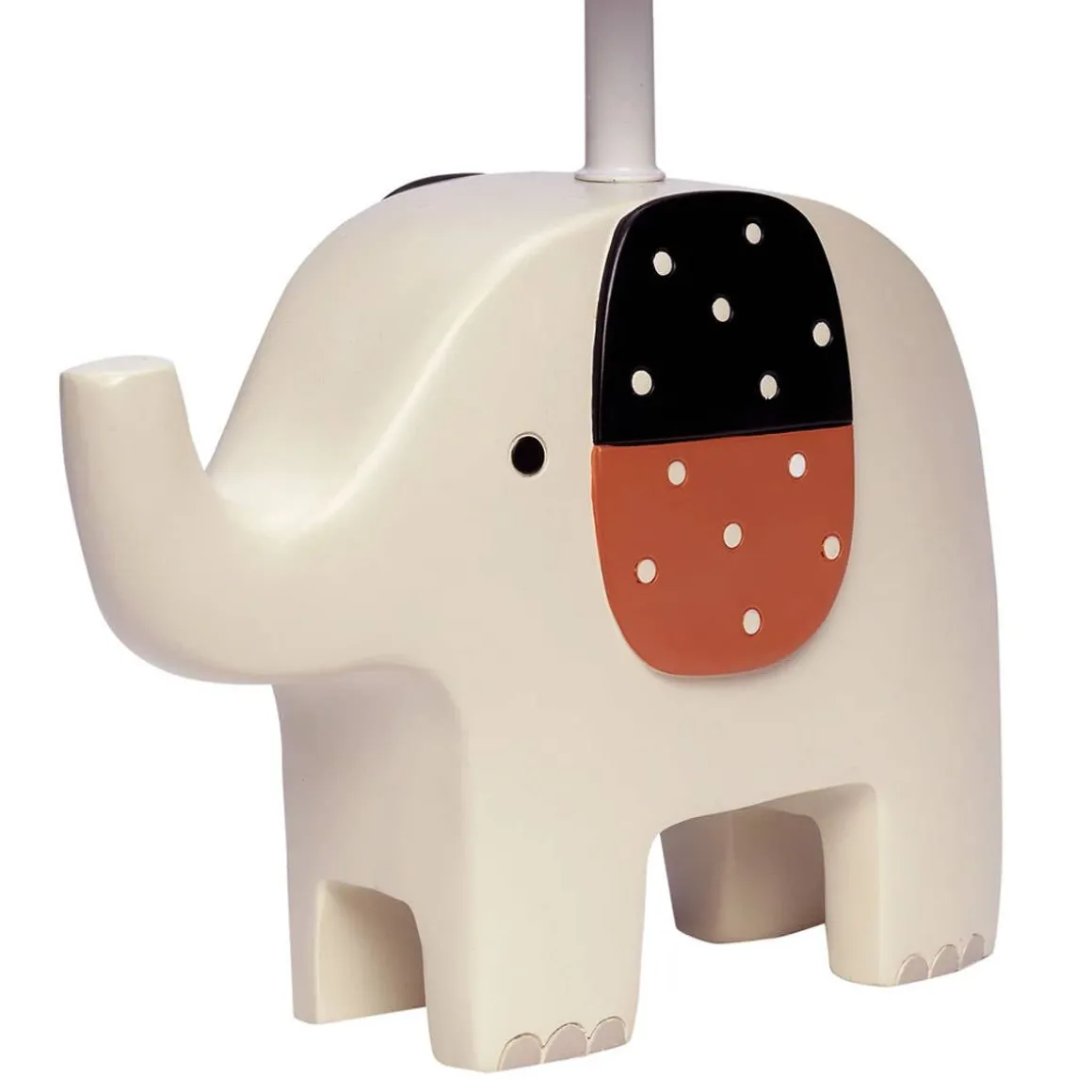 This custom hand painted 3-dimensional lamp features friendly cream-colored elephant with his two-toned ears. He is approximately 5 ¾” tall, 8” wide, and 3” thick. The total lamp height is 14”. It will add a soft glow to your child’s sleep space. It includes an energy efficient light bulb equivalent to 60 watts. It comes with a leaf printed shade with gray trim.
