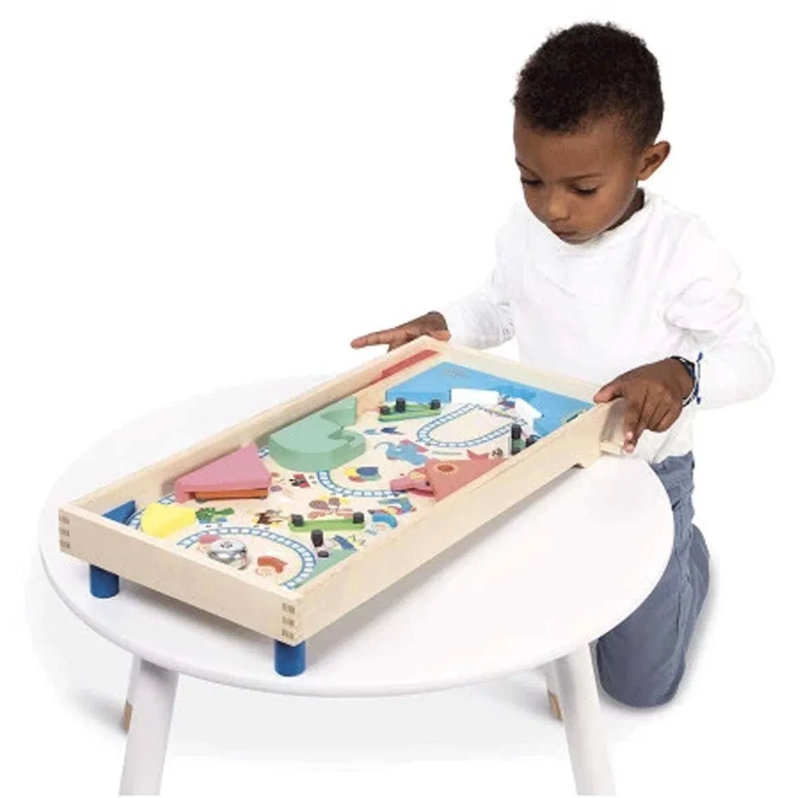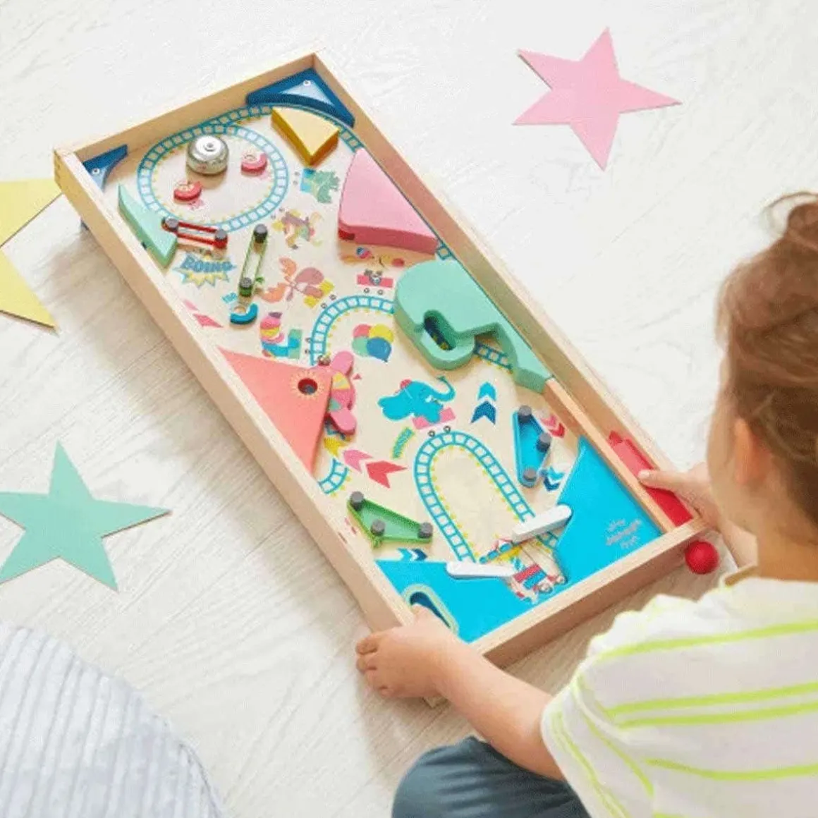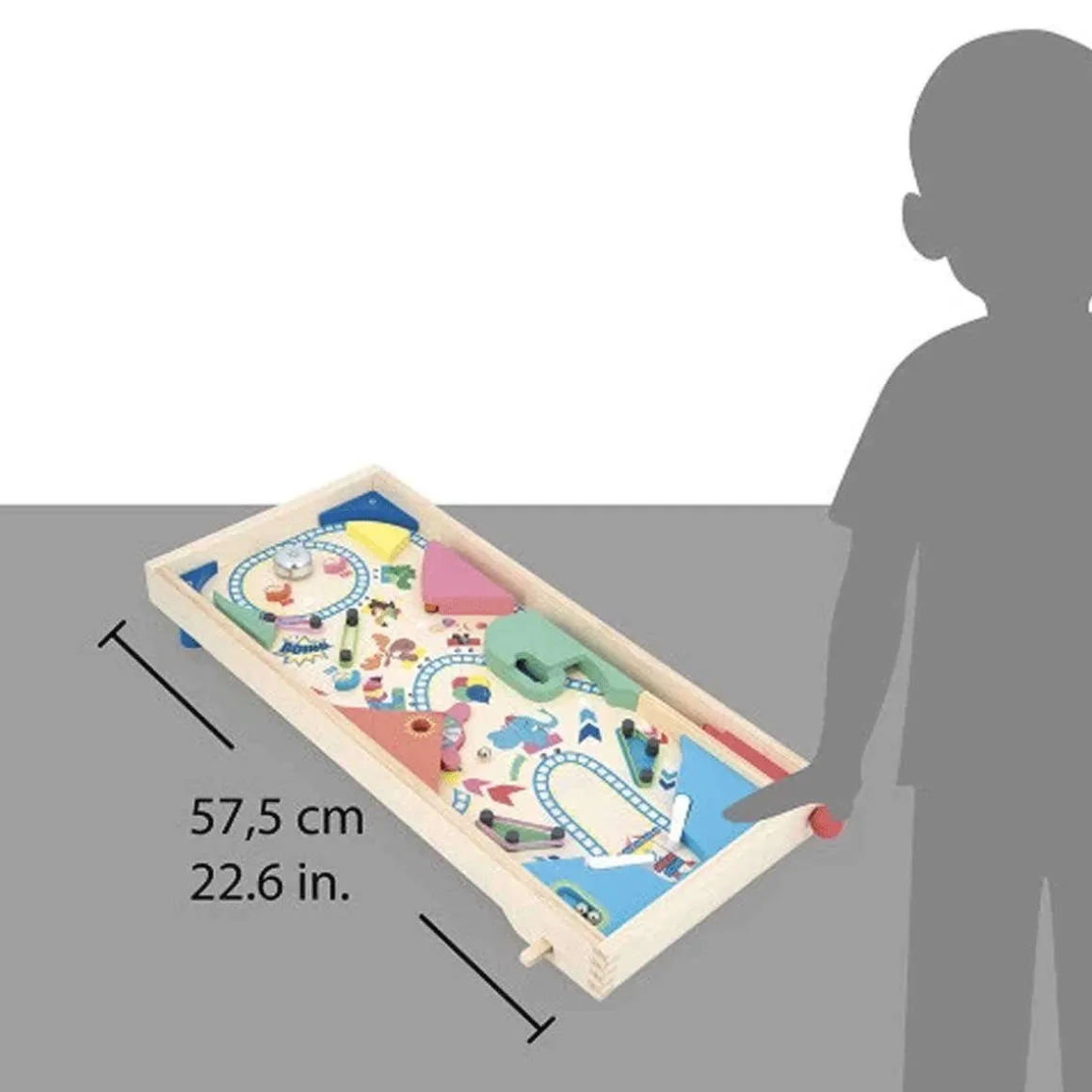 Shoot precisely and aim at the targets to hit the jackpot! With this wooden pinball machine, children aged 5 and over can develop their coordination and concentration through play. A tabletop pinball machine is also a great way to learn how to add up the points, and try to beat your personal record! With its funfair theme, this toy pinball machine comes with 3 metal balls. On the natural wood board, a crazy roller coaster sets the tone for the game: a festive game, full of twists and turns and suspense, where you quickly move from one emotion to another! 4 rubber bands act as slingshots to send the ball back with force, 1 wheel allows you to win more and more points, and 1 bell at the very top can be targeted to ring the victory signal! There are also plenty of bonus zones to collect extra points – everything you need for a frenzied game of pinball! Start a series of matches and take it in turns to face each other, or try to add an extra ball to the game when you reach a point target: many variations are possible for a game full of surprising effects! This wooden pinball machine measures 55 x 29.8 cm and is made from FSC™-certified wood from sustainably managed forests.