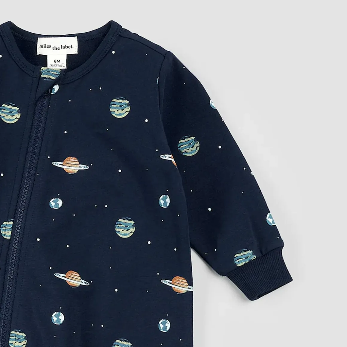 Perfect for little ones with their head in the clouds (or space), this Space print playsuit will be his new favorite. With organically grown cotton French terry, the playsuit is light and breathable while still being cozy and comfy for chillier days. With ribbed cuffs and ankles, their hands and feet are left free to drive their rocket ship or walk their first steps on the moon.