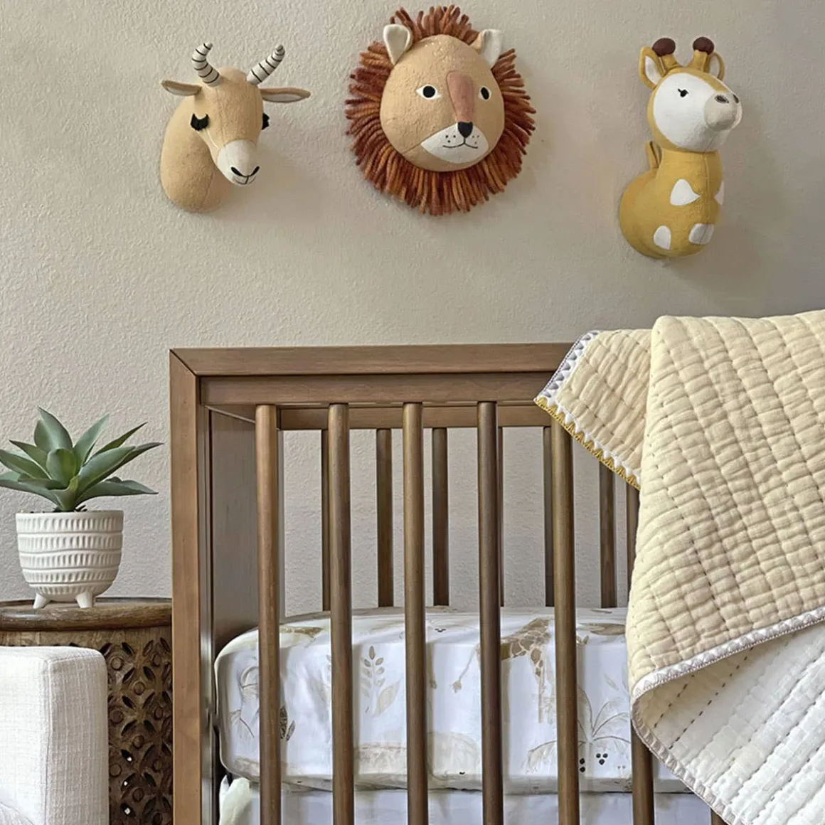 You’ll absolutely fall in love with this plush head wall décor. With a sweet face and beautiful coloring, this adorable piece will be your new favorite wall adornment. This adorable nursery wall décor can also be paired with other styles of Crane baby wall décor for a fun display that baby will love. Handmade details paired with the natural materials of this piece perfectly compliments Crane Baby bedding sets for a curated look.