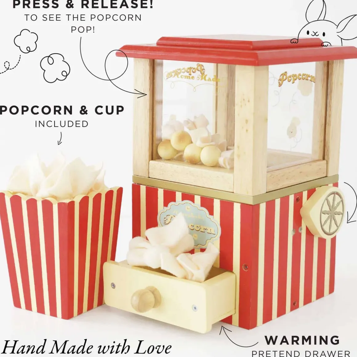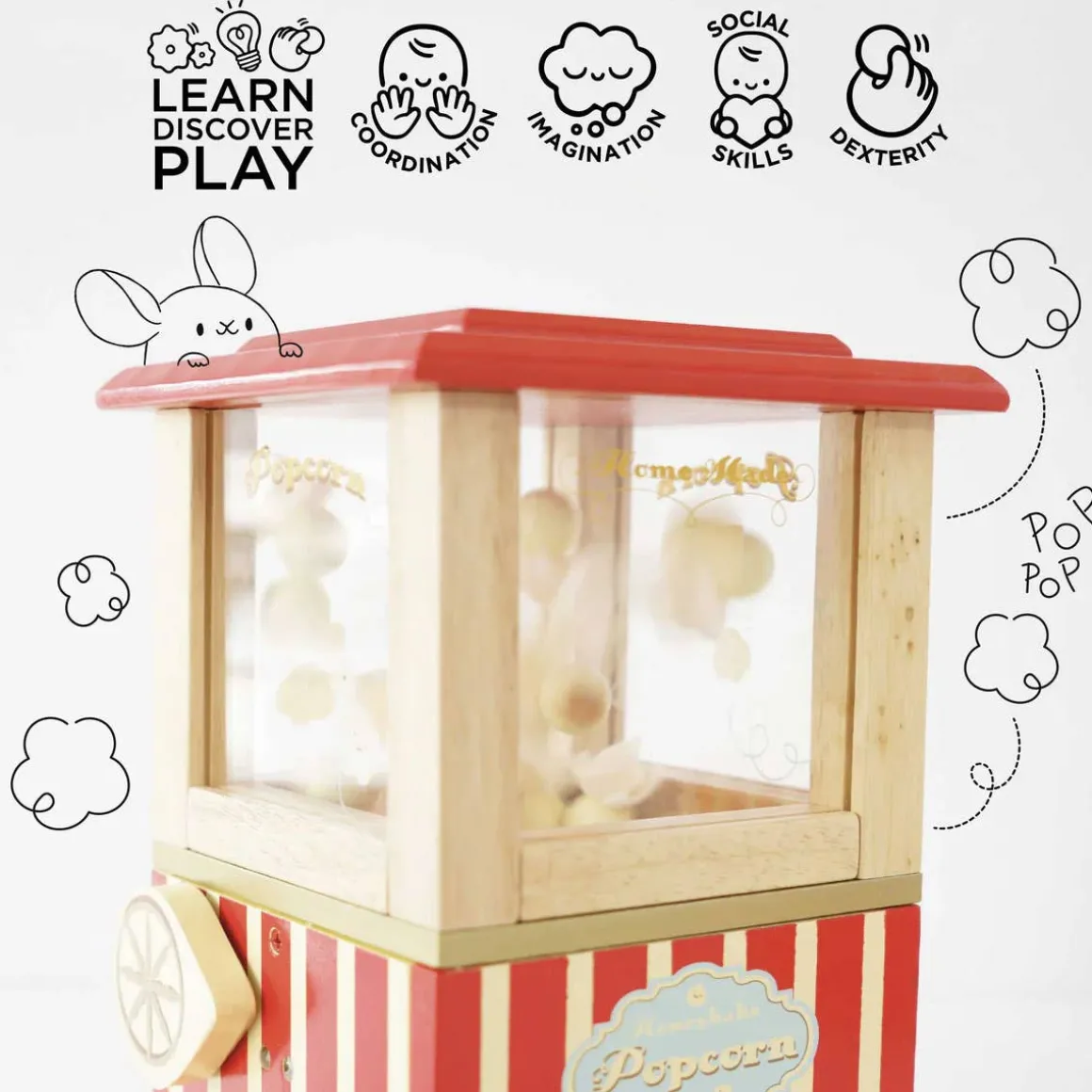 It’s showtime! This stunning, toy popcorn machine will bring the cinematic experience right into your home. Full of nostalgia and fun, this award winning toy is a firm favourite. Designed by highly skilled toy makers and exquisitely crafted from sustainable wood, this is no ordinary toy. Painted in vintage red and cream striped hues with a traditional look, young imaginations are sure to run wild with this fun toy, with many features to discover for inspired, realistic play. Hold down the “pop handle” and release to watch the kernels pop! Complete with 5 felt play popcorns to collect from the drawer and a colourful popcorn pot to serve them in. Ideal for honing fine motor skills as well as encouraging speech & social interaction. The packaging cleverly features ‘cut out and keep’ show tickets and sweet/salty popcorn tickets to for extended play value. An ideal gift for a special little one to treasure for many years of play. Why not pair with the Showtime Puppet Theatre and put on a show to remember!