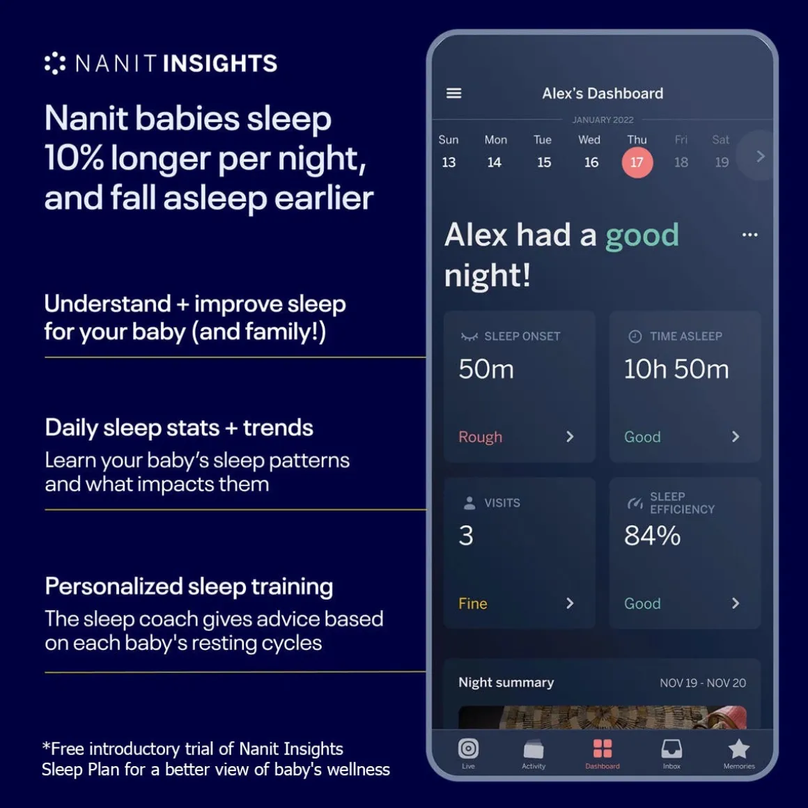 - Includes Nanit Pro Camera, Flex Stand, 1 small Nanit Breathing Band & Free introductory trial of Nanit Insights Sleep Plan for a better view of baby’s wellness