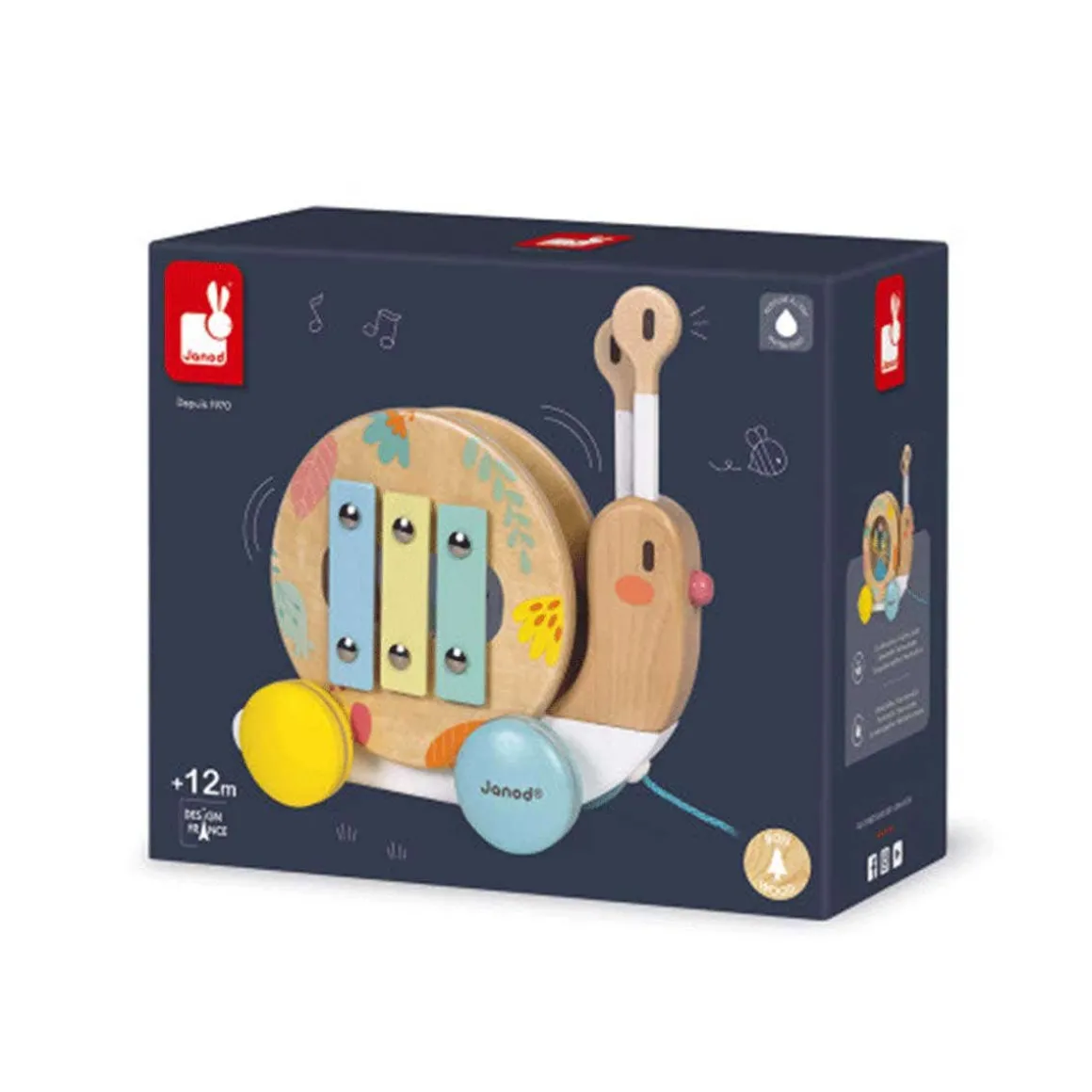 This wooden snail to pull-along is very funny! The shell turns when you walk it and is removable to reveal a tambourine and a small xylophone! The antennas of the snail are also removable and form the rods. A nice companion in very soft and very modern tones that will awaken your child to music in a ludic way!