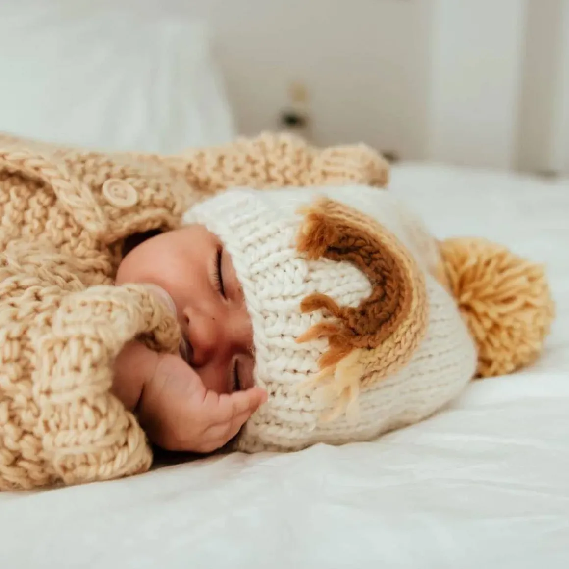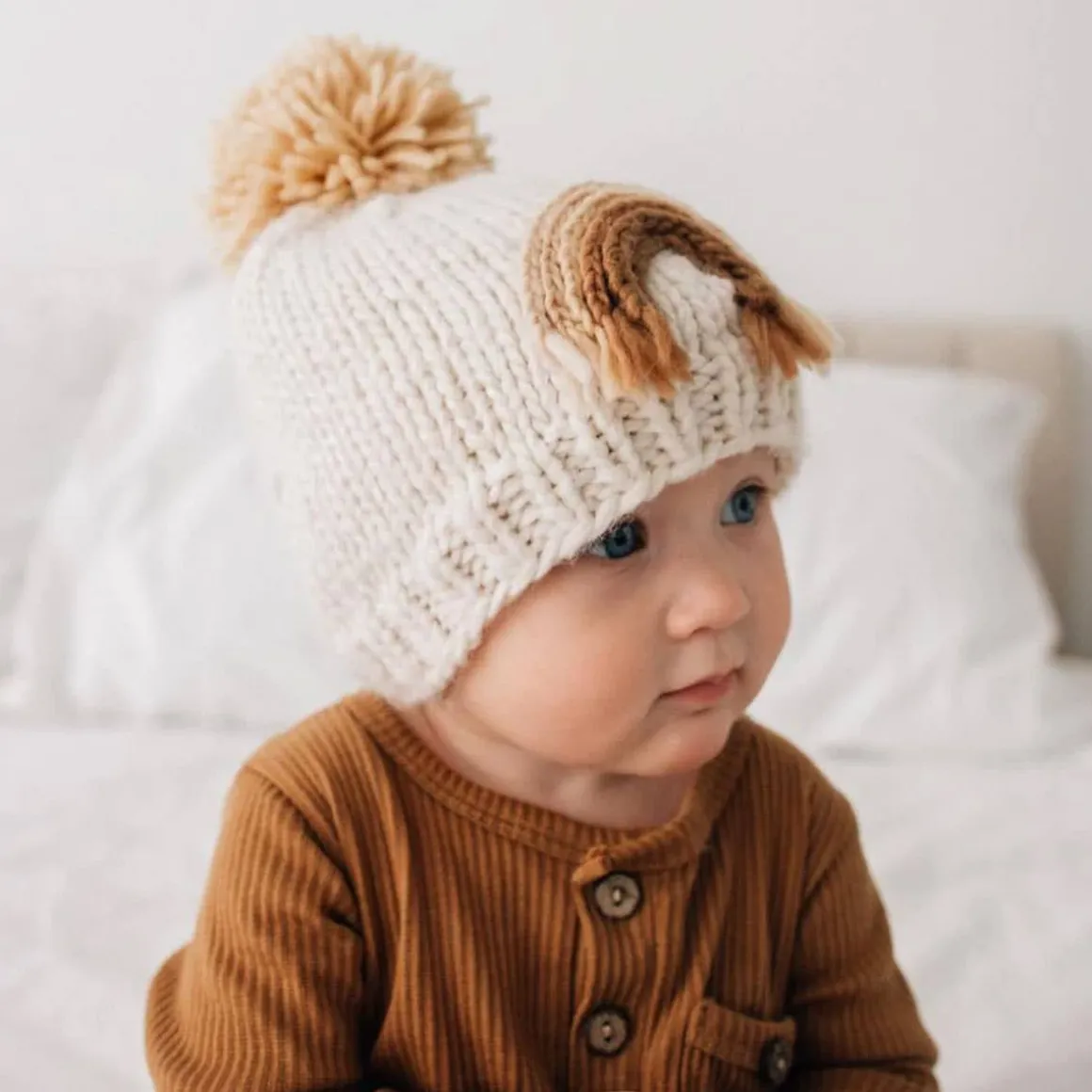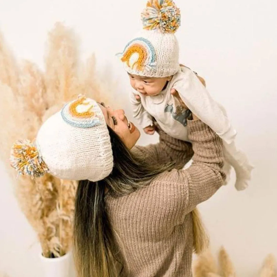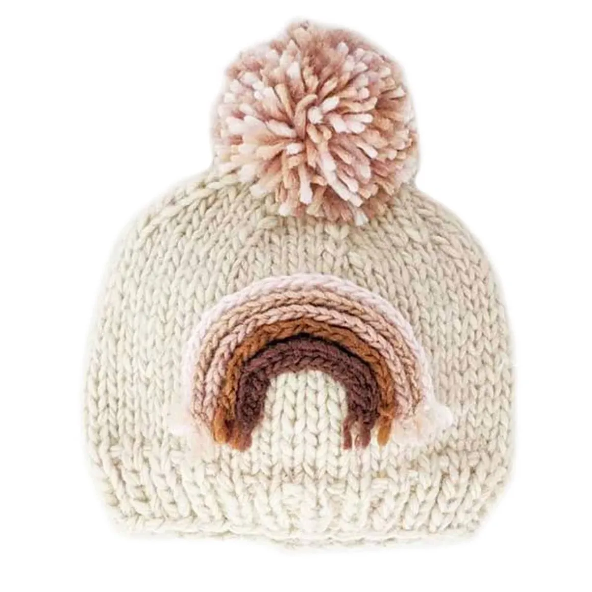 You’ll love this beautiful beanie hat in cozy natural colored yarn, adorned with a rainbow in rich hues. Topped with a pom pom, this looks great with everything and is a fun gender neutral gift for rainbow babies.