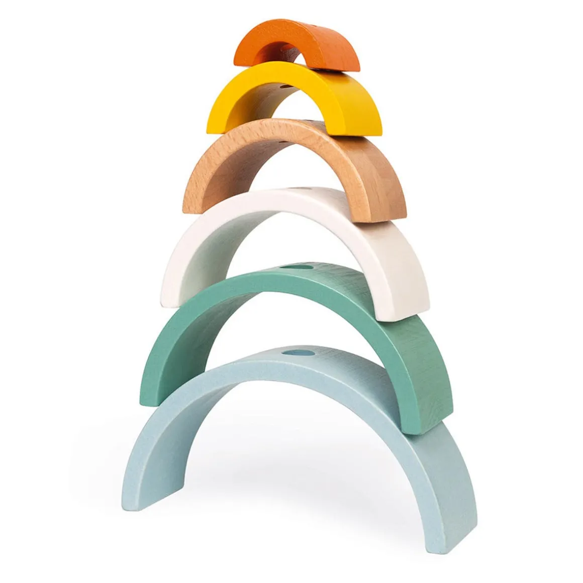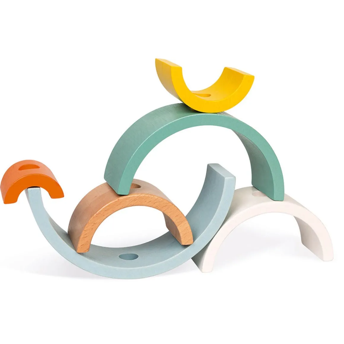 Your child will love to walk this pretty wooden turtle with its rainbow shell composed of 6 wooden arcs of circles. The rainbows pile up at will to form an original construction game. This wooden toy is part of the Sweet Cocoon collection, a delicate colors range, inspired by current trends to gently accompany your child’s first learnings!
