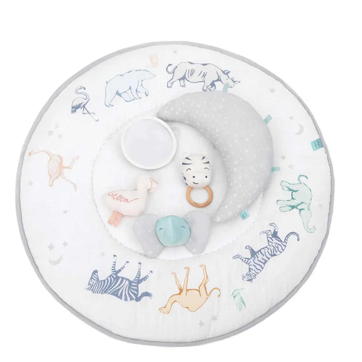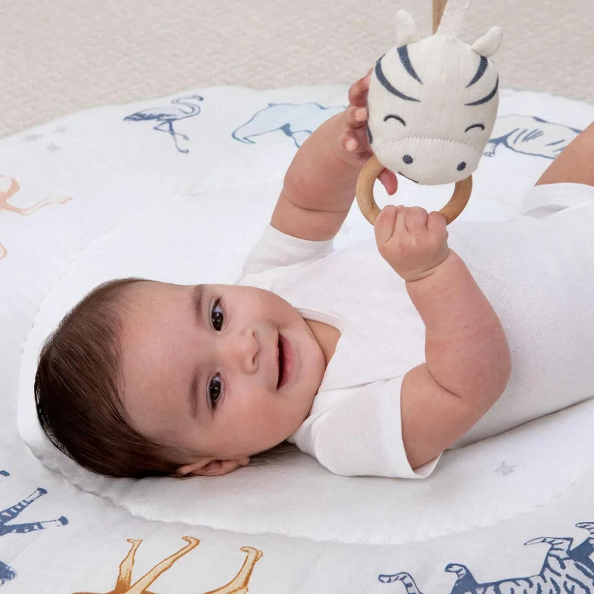 The aden + anais Rising Star Activity Gym keeps baby occupied with multiple features that support key developmental milestones. The premium birch wood and signature muslin delivers both the ultimate in comfort and development for baby as well as style to complement a modern home. It is a great place for tummy time while also stimulating sensory development, hand-eye coordination and self discovery.