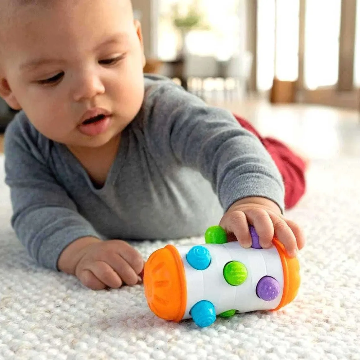Experience the magic of sensory learning with “Roll into Wonder!” Rolio. Watch in awe as the colorful textured pegs move in and out, propelled by the soft silicone tires as the cylinder rolls. With its captivating textures, delightful rattling sound, and portable design, this sensory toy is perfect for little ones to explore anytime, anywhere. Sensory learning has never been more engaging than with Rolio!