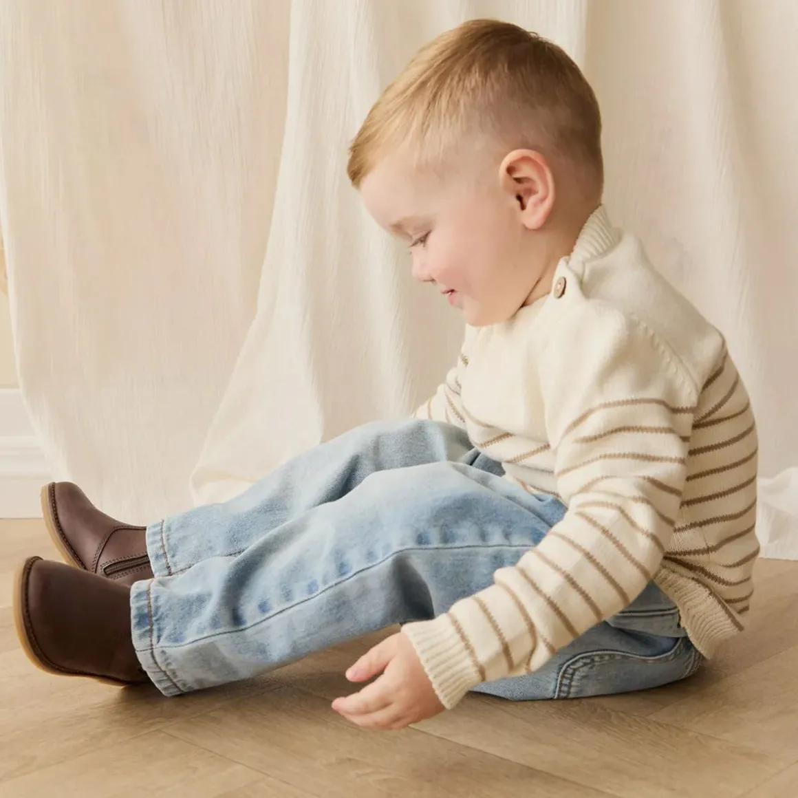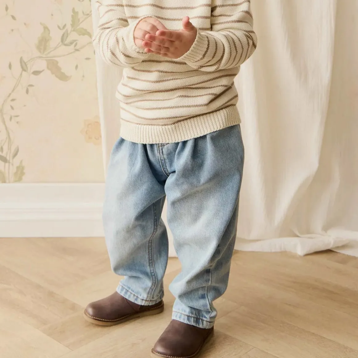 The Rueben Pant in Antique Blue is a timeless denim essential for your little one’s wardrobe. Featuring an elastic waistband with a button closure, two front pockets, and visible stitching, these jeans offer a relaxed fit in a soft vintage wash – perfect for everyday wear and effortless style.