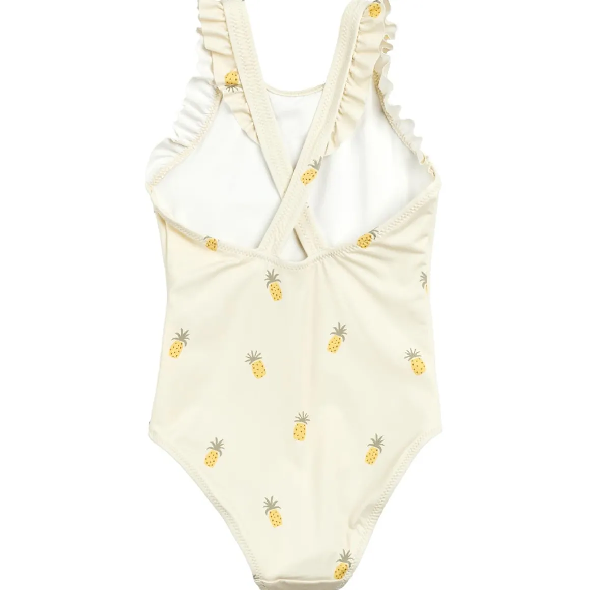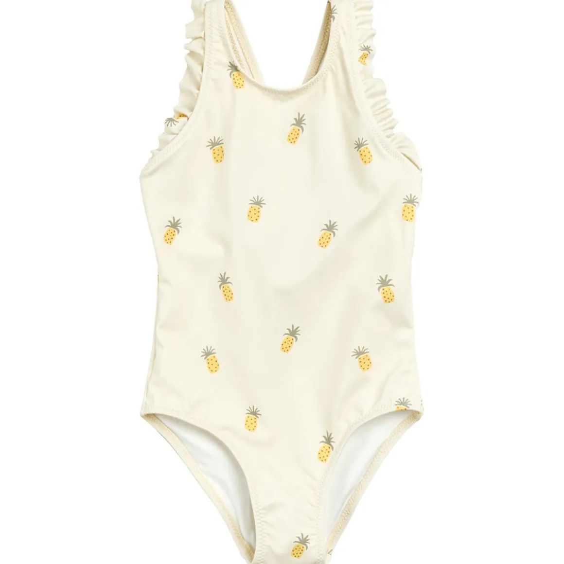 This pretty white swim bodysuit is perfect for sipping on fruity slush by the pool. With a Pineapple print, it has ultimate vacay vibes and coordinates with pieces available for brothers. The crossover straps have a supportive and comfortable fit and are finished with a fluttery trim. Made from recycled nylon and elastane for stretch, the one-piece has plenty of flexibility and includes built-in UPF50+ sun protection.