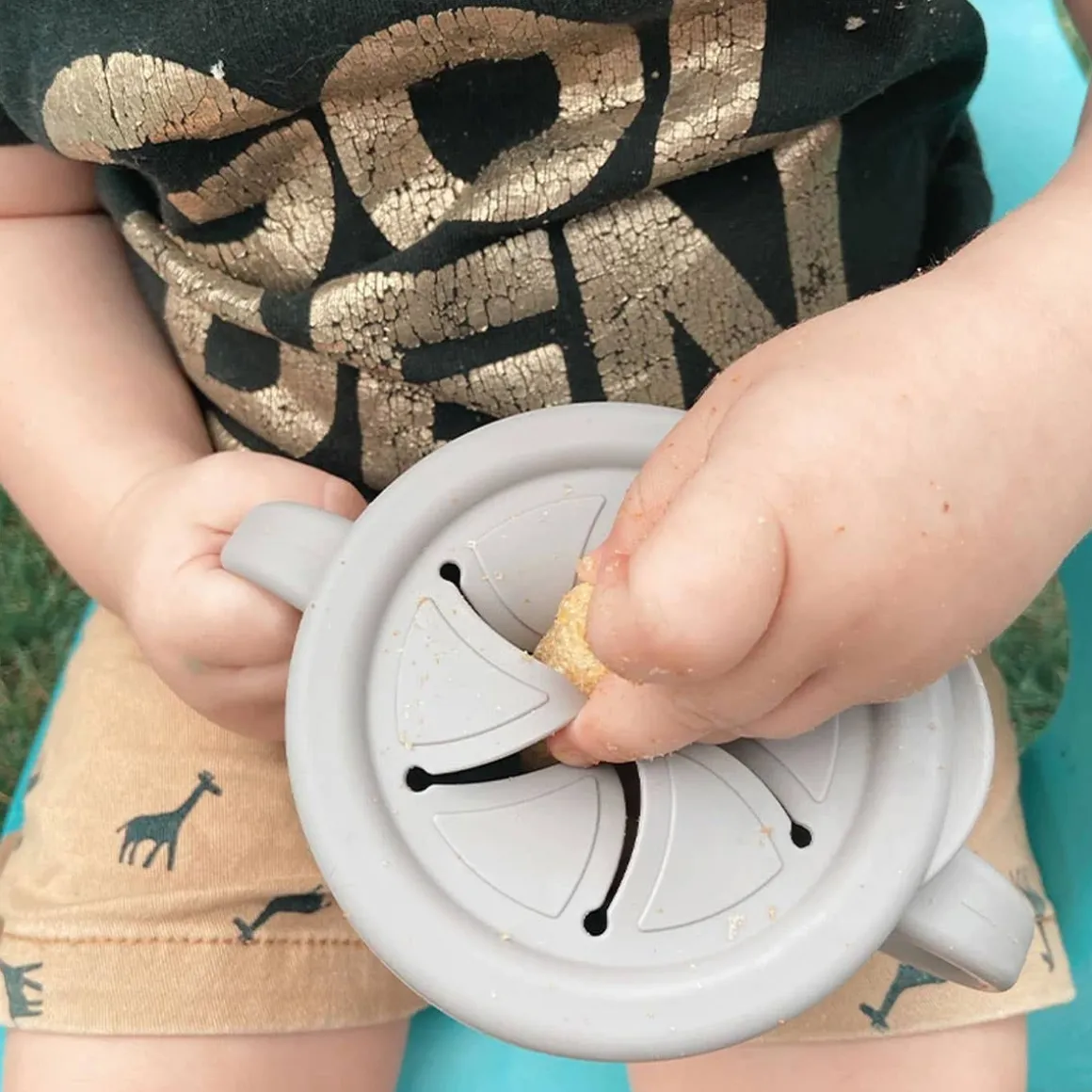 - Spillproof snack lid lets baby grab food by themselves without making a mess.