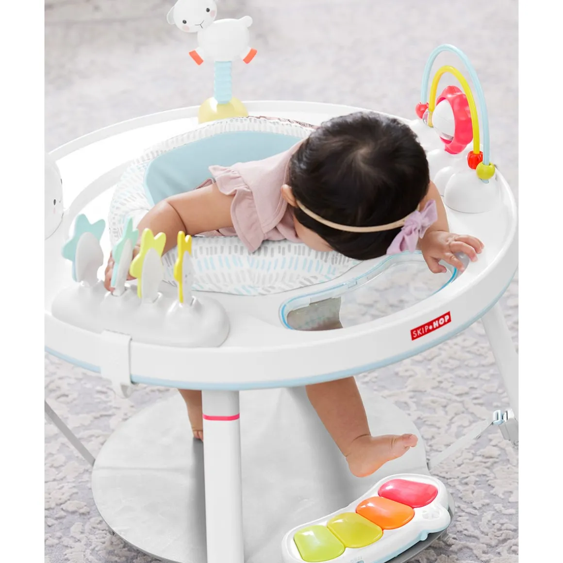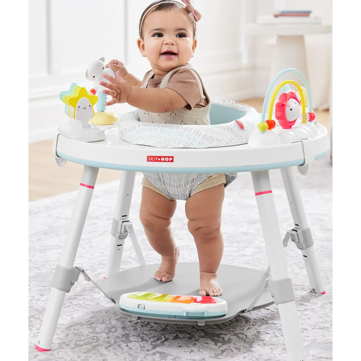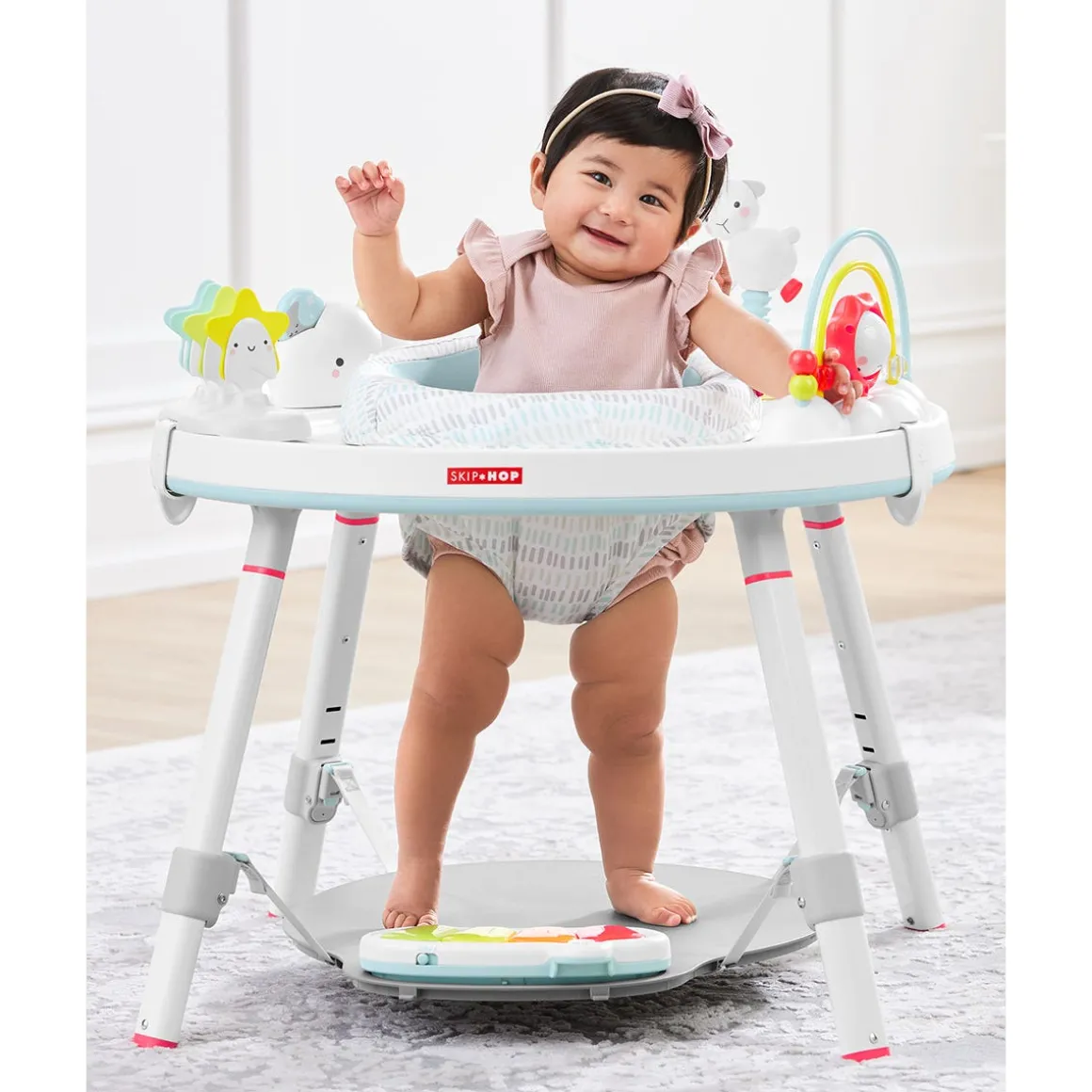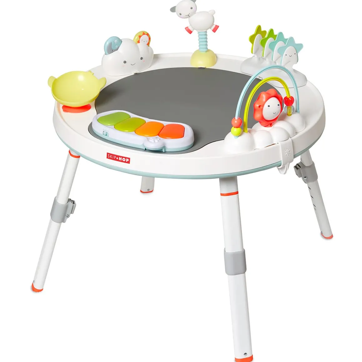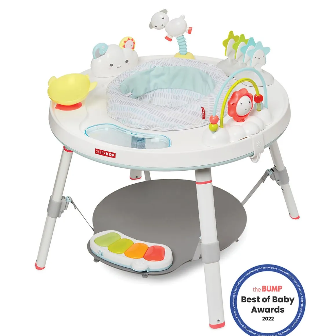 Designed to grow with baby in three stages, Skip Hop’s baby activity center is an action-packed take on Skip Hop’s best-selling Silver Lining Cloud gym. Featuring the same developmental approach to play and learning as Skip Hop’s Explore & More™ activity center, the décor-friendly design features a 360-degree rotating seat for baby to swivel and bounce. Skip Hop’s unique Discovery Window gives little ones a clear view of their feet as they play the light-up piano to connect cause and effect. Four dreamy toys can be rearranged for customized play. As baby grows, the activity center converts for easy cruising. At stage three, it transforms into a sturdy toddler table with a plastic chalkboard surface for drawing, playing—the sky’s the limit!