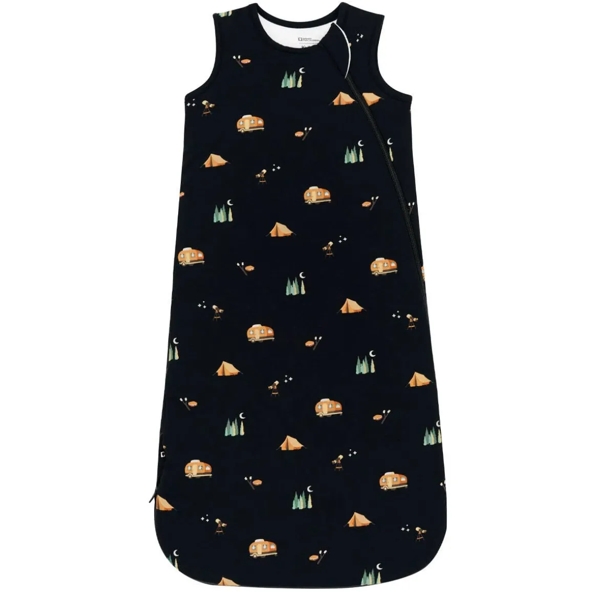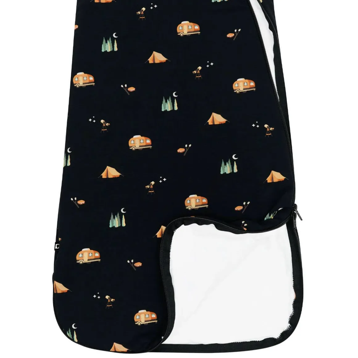 A repeating, all-over print featuring a telescope viewing a cluster of stars, a s’more next to two marshmallows on a stick, a cluster of tall trees under a waning crescent moon, an orange camping tent, and an orange camper trailer over a black background.