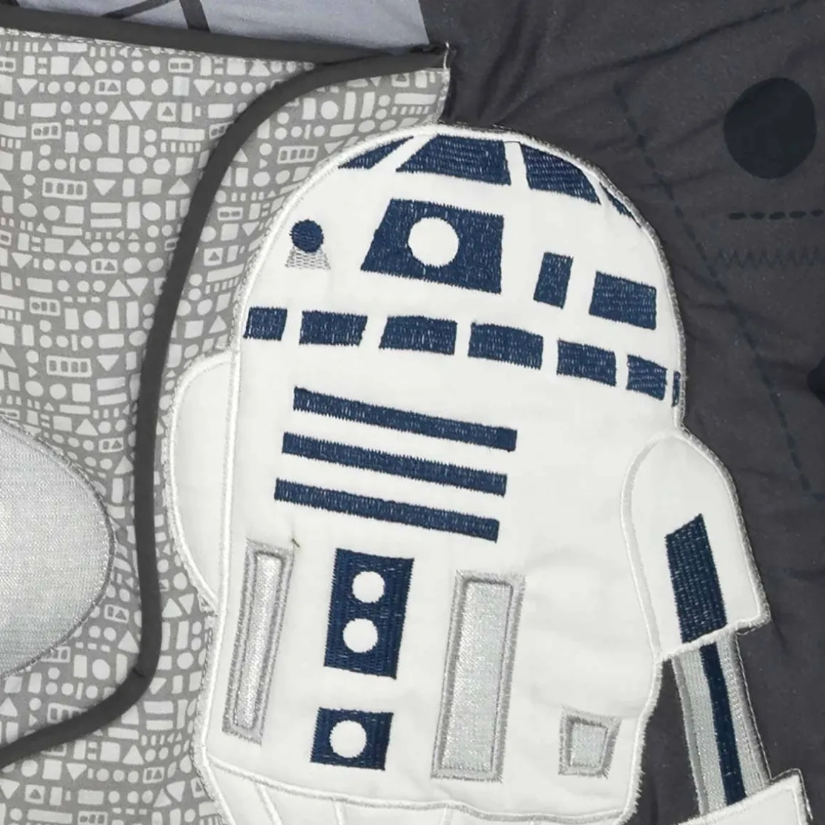 - Textured applique characters (Chewbacca, R2-D2, and C-3PO) are expertly detailed and embroidered