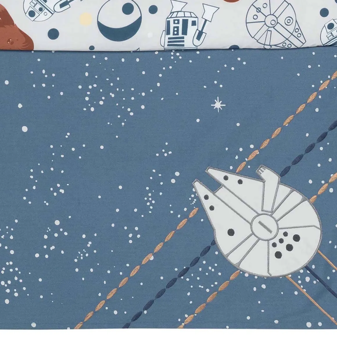Your little padawan (Jedi-in-training) will love how their nursery is transformed into a Star Wars Millennium Falcon adventure from a galaxy far far away. The three-piece nursery crib bedding set includes one quilt, one breathable 100% cotton fitted crib sheet and one crib skirt. The quilt features a 17” tall Chewbacca made in a high pile fur texture brown minky fabric complete with his bandolier which is embroidered in black and white. C-3PO is next to him, is 11” in height and is appliqued in a yellow fuzzy soft minky fabric with gold metallic embroidery stitches. Our favorite droid, R2D2, is 8 ½” tall and is appliqued with white cotton twill, silver knit and dark blue embroidery stitches. An amazing interior view of the iconic holochess scene of Chewbacca and C-3PO playing Dejarik in the Millenium Falcon is featured on this amazing quilt. The 31” wide couch is behind the holochess table, which features metallic fabric details, and is trimmed with gray cording. Outside the Millennium Falcon is the misty blue galaxy print filled with planets, star dust, X-Wings, Tie Fighters, and a metallic Death Star. The quilt also has a shell stitch embroidery detail. The back of the quilt is the dusty blue galaxy in a cotton rich twill. The breathable 100% cotton fitted crib sheet is a tossed print with Chewbacca, C-3PO, R2D2 and the Millennium Falcon. It is on a gray ground and has elastic all the way around ensuring a safe and secure fit on a standard size crib mattress measuring 52” x 28”. The blue galaxy print crib skirt has a 16” drop, shell stitch embroidery, and the appliqued Millennium Falcon with embroidered stitching is on the right corner panel.
