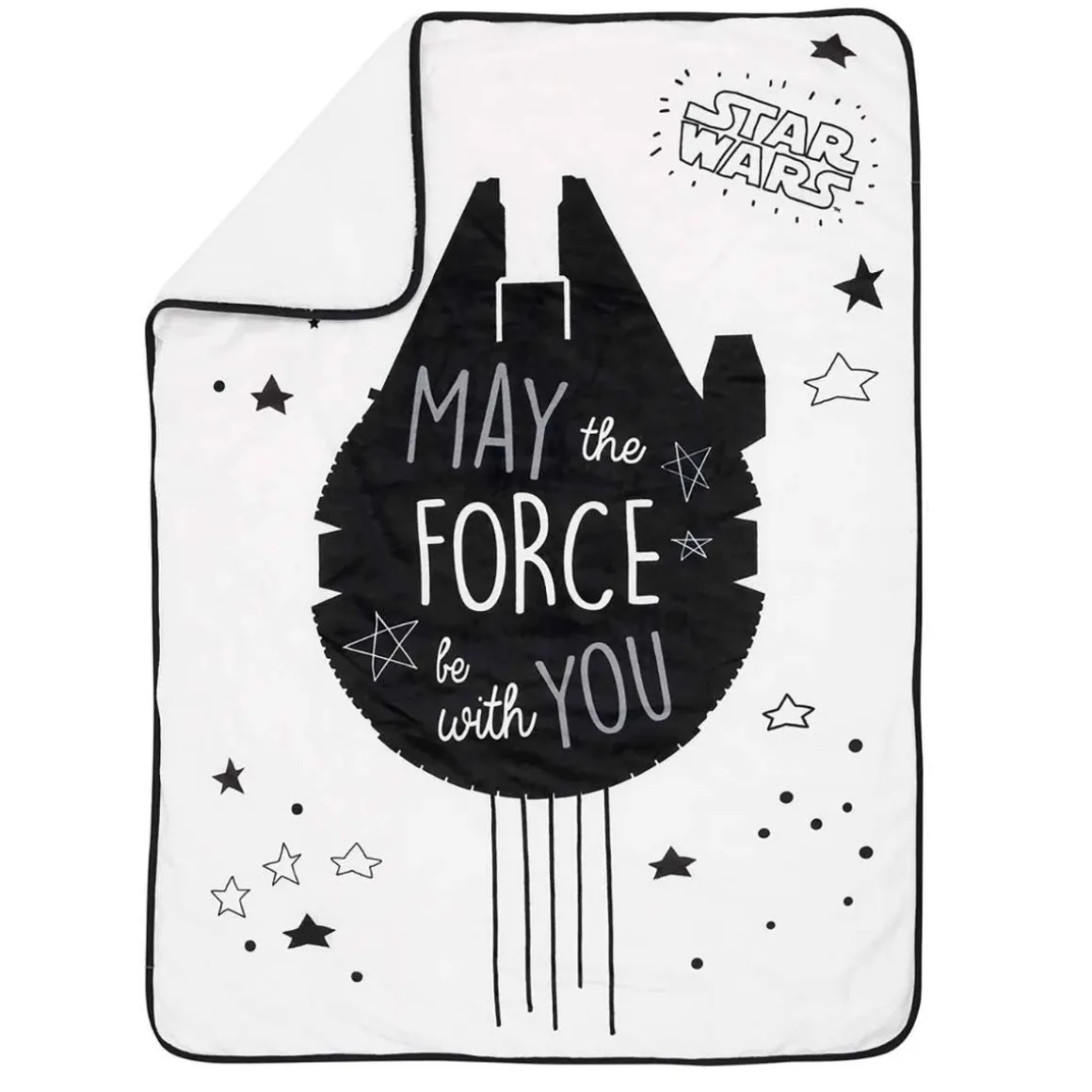 Your little padawan (Jedi in training) will love this officially licensed Millennium Falcon baby blanket. The large black Falcon is 23” in length and is featured in the center of this soft minky blanket. MAY THE FORCE BE WITH YOU is printed in gray and white along with Tie Fighters, the Death Star, stars, and the words Star Wars. The back of the blanket is a cozy white Sherpa. This makes the perfect stroller blanket sized at 30” X 40”. A top baby registry pick and favorite baby shower or welcome home baby gift.