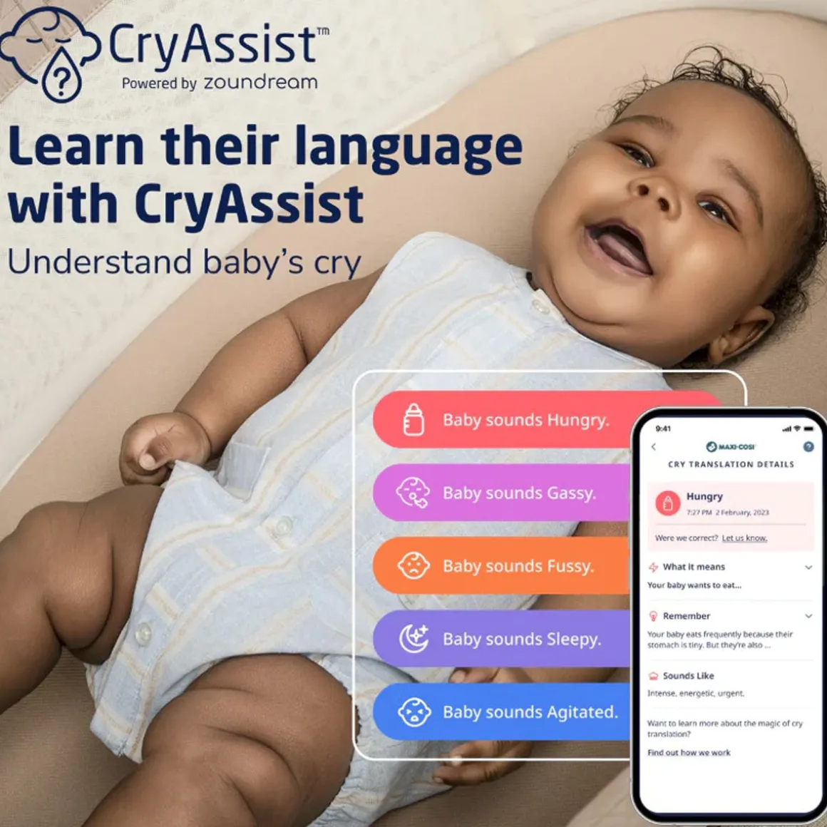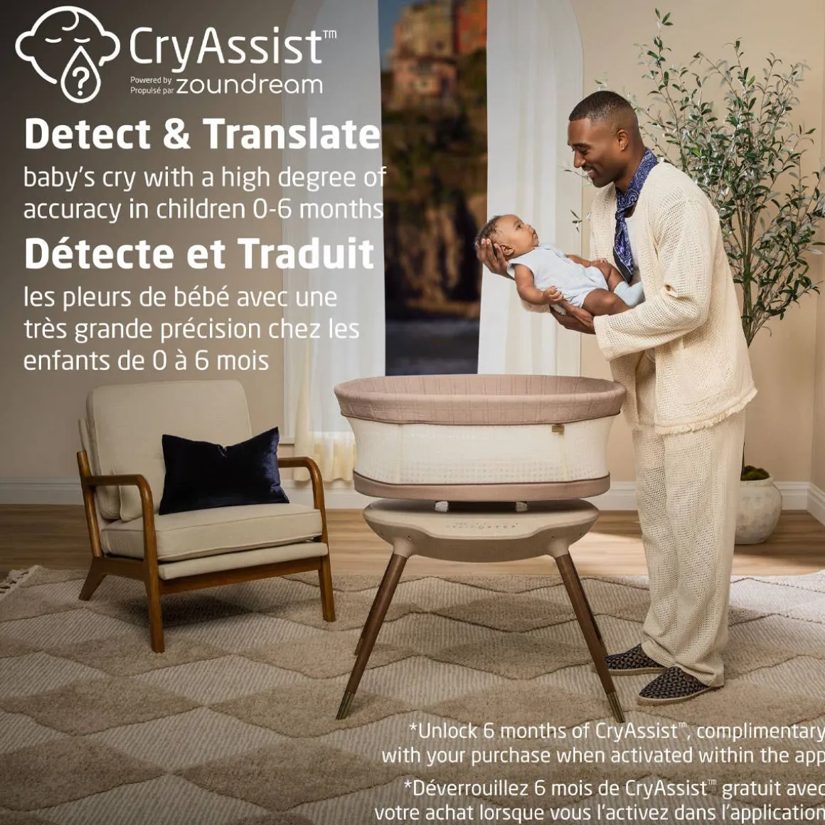 Powered by Zoundream CryAssist™ technology, the bassinet detects & translates your baby’s cries to identify if they’re sleepy, fussy, gassy, agitated, or hungry, enabling quick and confident responses. The first 6 months are crucial for understanding your newborn’s needs, yet their cries can feel like an unsolvable mystery. CryAssist™ helps bridge this communication gap, offering parents clarity during this critical stage.