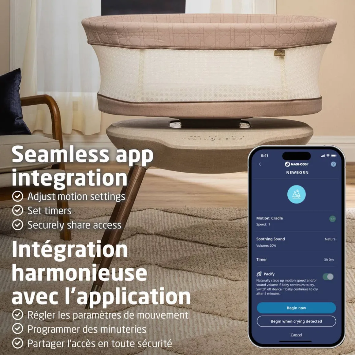 The Maxi-Cosi Starling Smart Bassinet from the Kindred Collection combines soothing motion, AI-powered cry translation, and smart connectivity to promote peaceful sleep for babies up to 20 lbs.