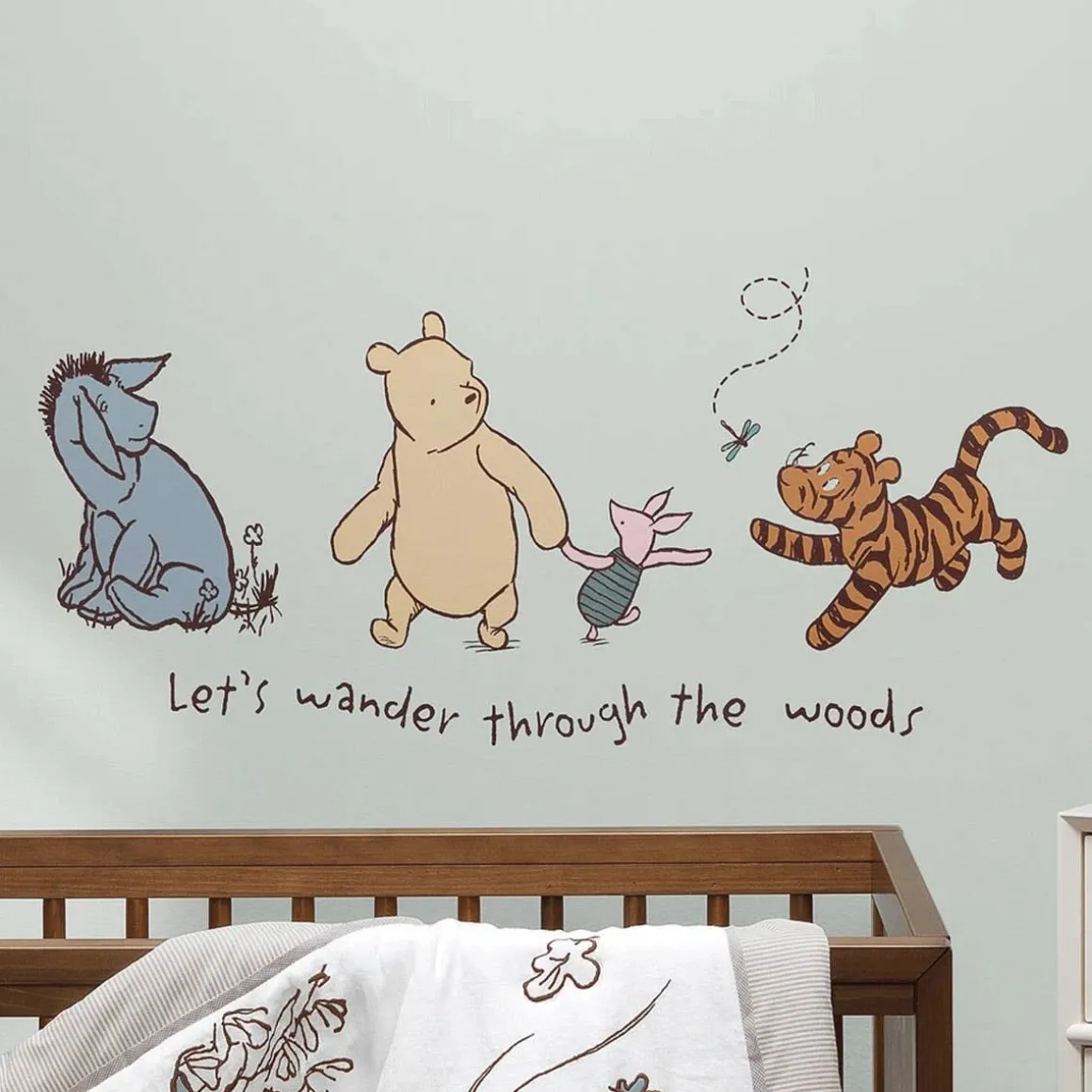 Add a designer touch to a feature wall in the nursery with these custom Storytime Pooh wall decals. Included is Pooh, Piglet, Eeyore, and Tigger, who loves chasing the dragonfly, along with the message “Let’s wander through the Woods.” These are easy to apply and will not harm your walls.