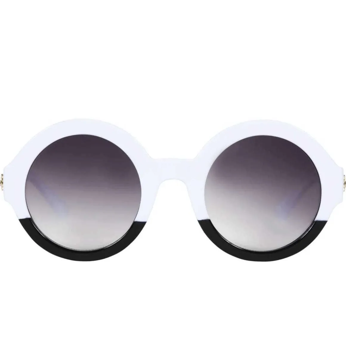 The Palm Springs sunglasses have dark rims with a pink/purple/clear colored reflective lens.
