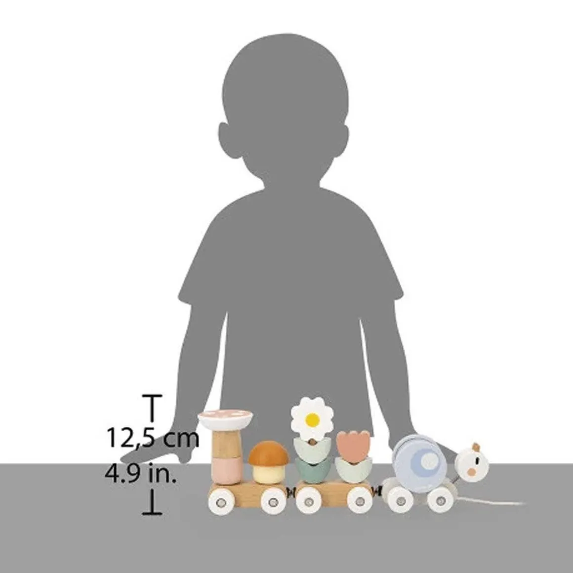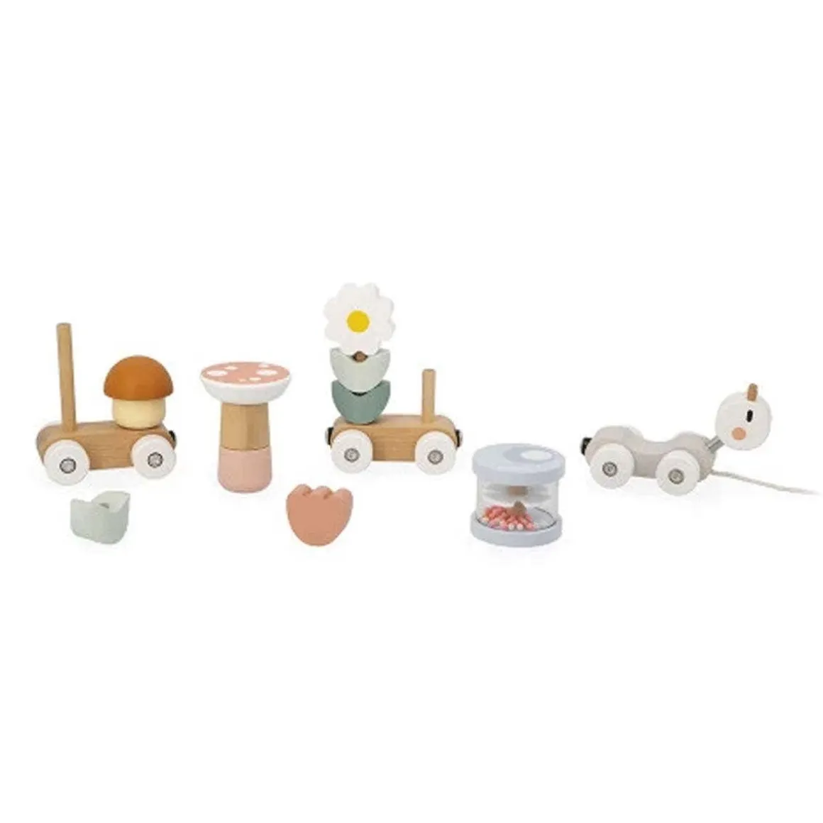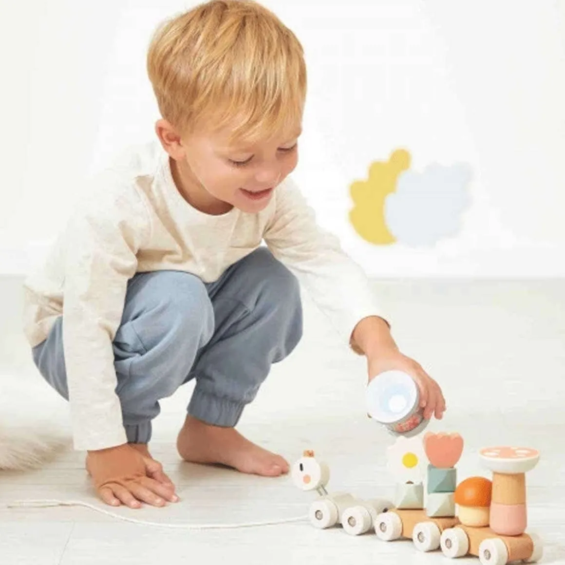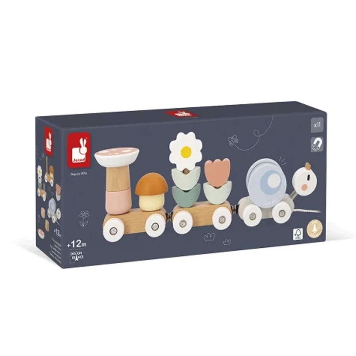 With this 2-in-1 wooden train for babies, it’s time for motor skills from 12 months. A pull-along toy, but also a construction set, this pretty early-learning toy features 3 magnetic wagons and 10 pieces to assemble. The various shapes, sizes and colors of the elements encourage your little one’s sensory development. It’s in the fresh, bucolic world of the garden that baby develops his fine motor skills and coordination, to help him grow. First, you familiarize yourself with the pieces and stack them on the train: 2 flowers and 2 mushrooms are to be put back together. And then, surprise: the shell of the snail at the head of the line is none other than a transparent marble rattle! Baby can shake it to make it sound and stimulate his hearing, as well as his sight by carefully observing the marbles inside. Cleverly, when the rattle is placed on the snail’s back, it rolls on itself as the train moves along! As your little one grows and progresses, it’s walking that he’ll discover in the company of his first-age toy. He grabs the string, and off he goes! Let’s go for a walk with his little snail train! Encourage your baby’s gross motor skills and imagination with this tender walking toy. In its 32 x 6 x 12.5 cm format, it comes with a 50 cm long string. From Sweet Cocoon collection, this wooden snail train is made from FSC™-certified wood.