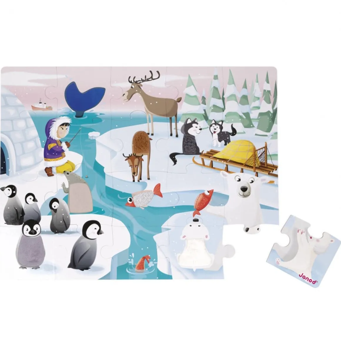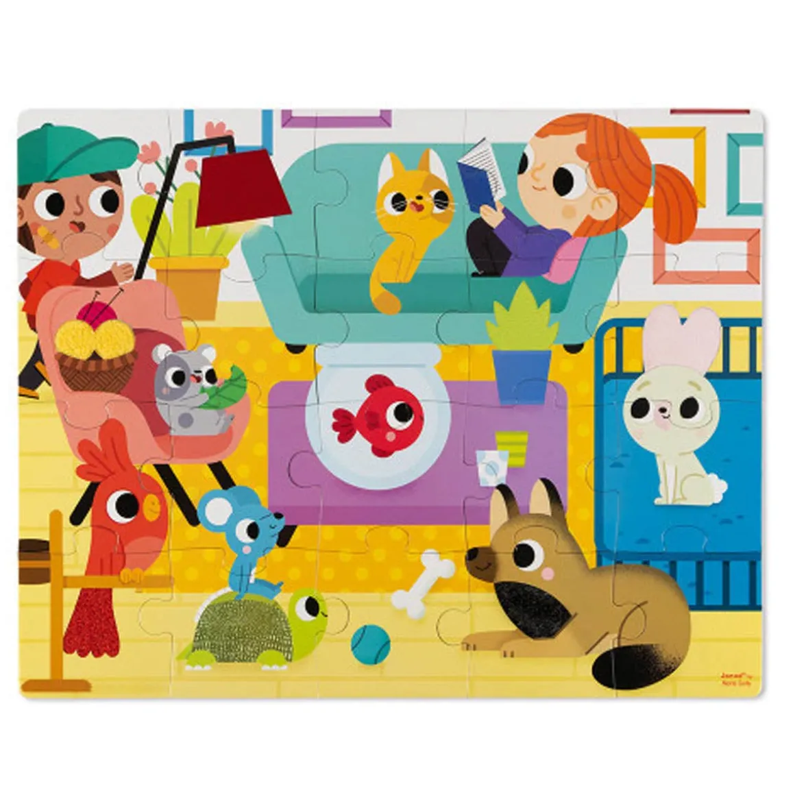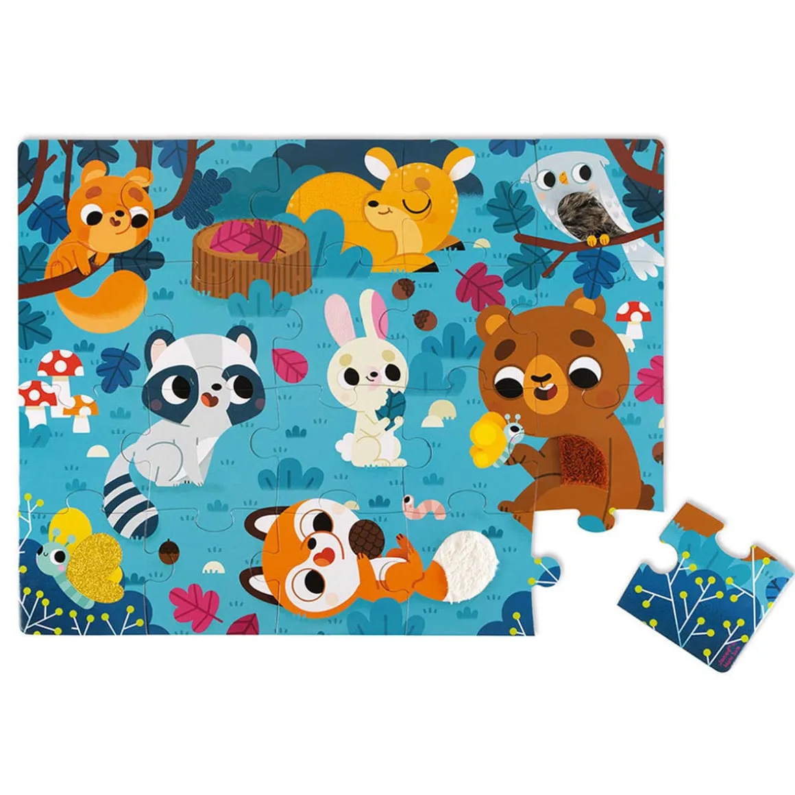 Giant 20-piece puzzle in rigid cardboard, with 7 pieces with textures. Illustration with bright colors on different themes. Poster included. Pack: Gift box with some textures on the lid.
