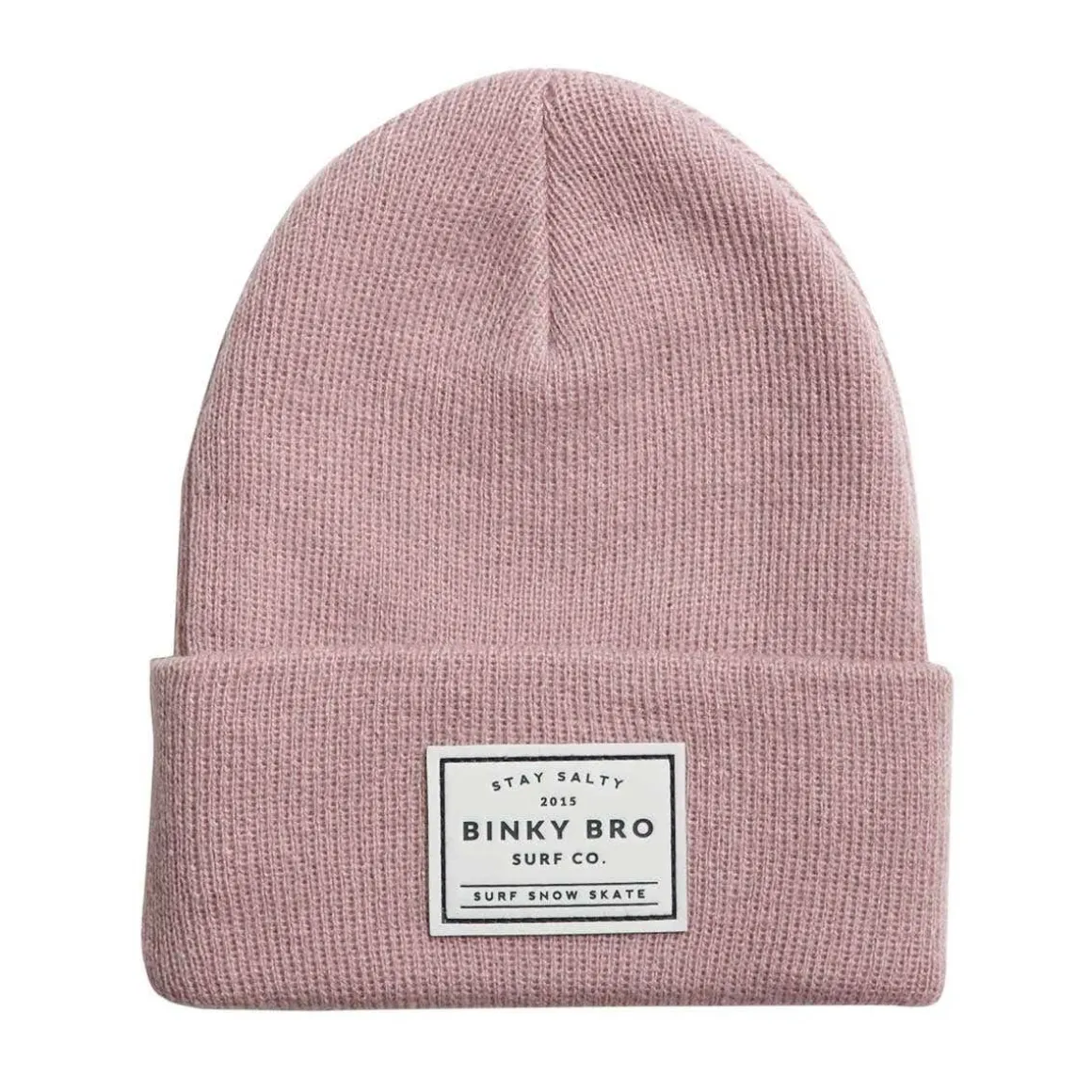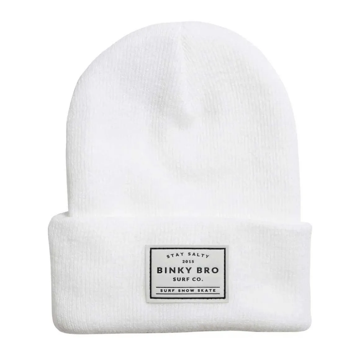 The Tahoe beanie is 100% acrylic. It has a “BinkyBro Surf Co–Surf|Snow|Skate” embossed patch on the front. Sizes are currently available in newborn, infant, toddler, youth, and adult.