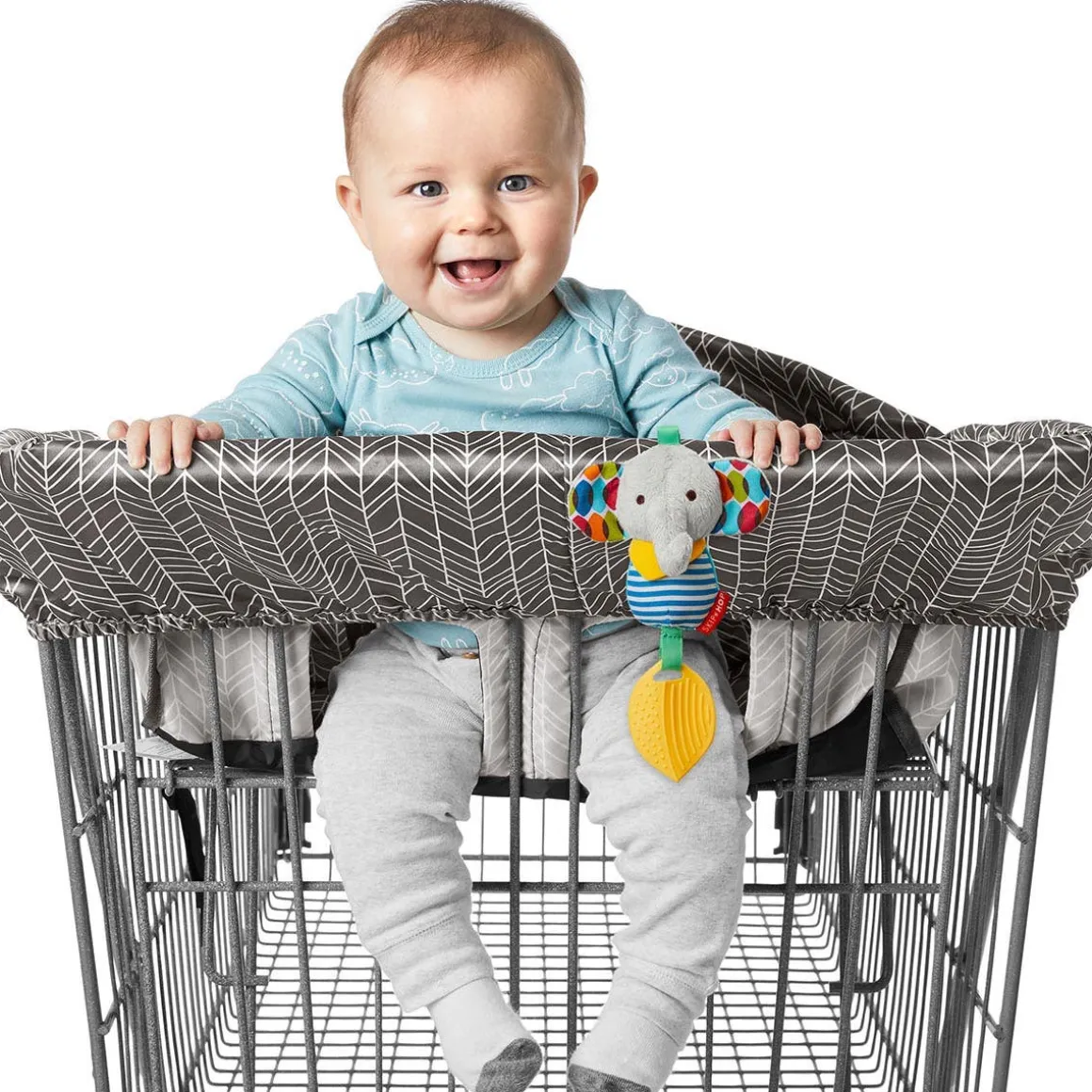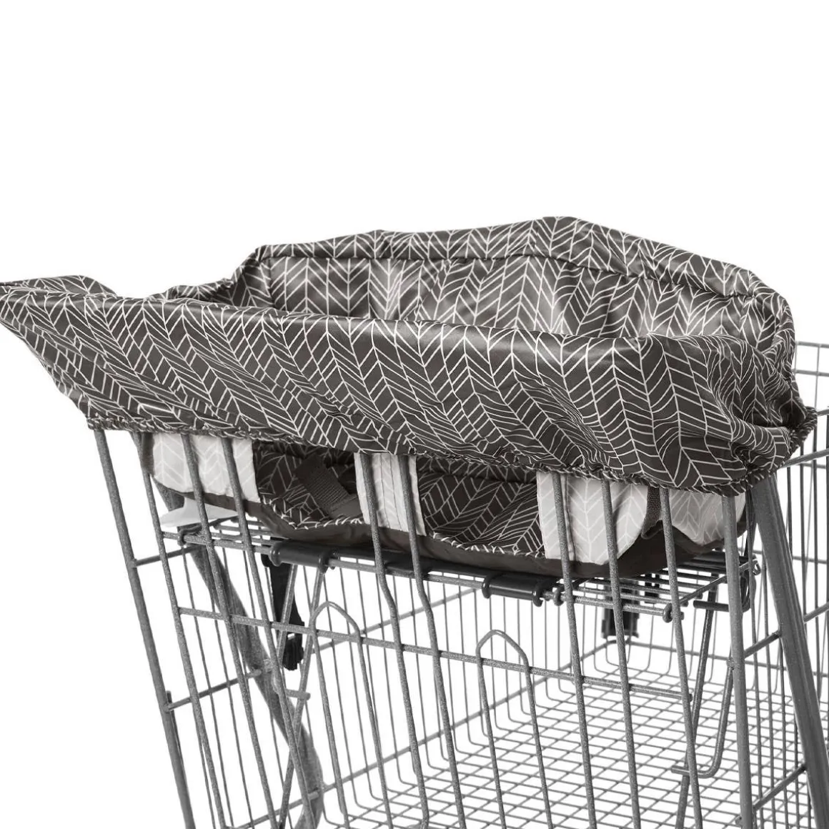 Protect little ones from germ-covered shopping carts at supermarkets and stores with our convenient machine-washable liner. Complete with a padded seat and leg openings for extra comfort, our stylish shopping cart cover features a built-in pouch so it’s easy to fold, grab and go! It also makes a handy high chair cover in restaurants. Attach favorite hanging toys (sold separately) to the two front loops, keeping baby entertained as you shop or dine.