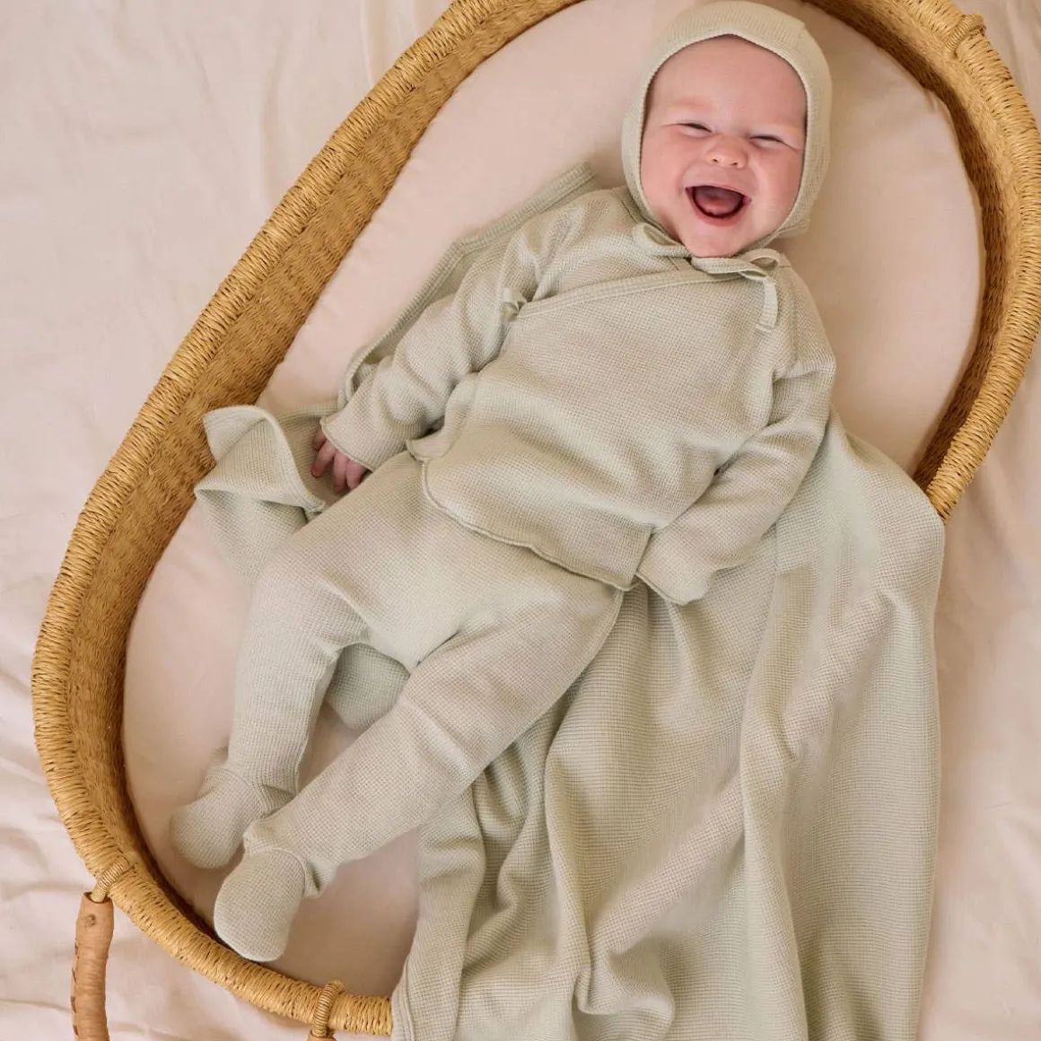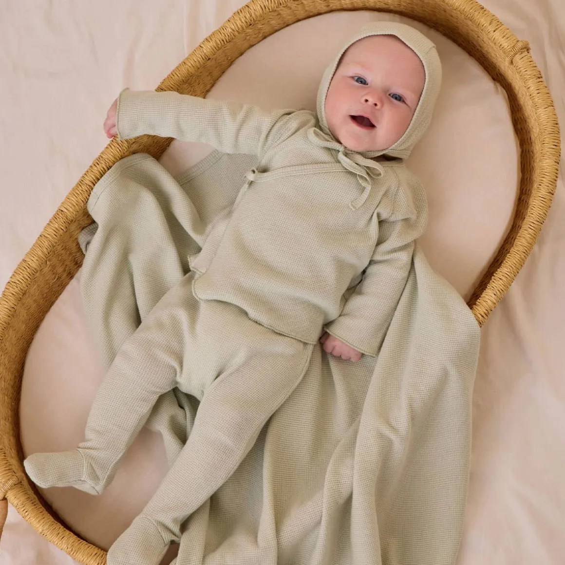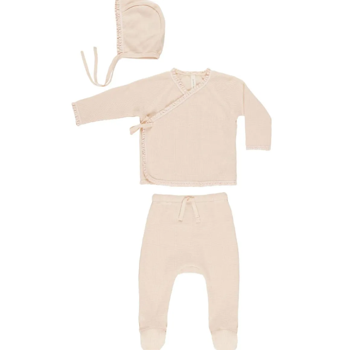 Quincy Mae’s Take Home Set in lightweight waffle material is the perfect look for your newborn. Featuring a sweet bonnet, wrap snap top with crochet lace ruffle detail, and footed drawstring pants.