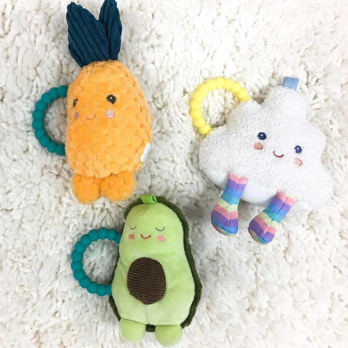 These adorably cheerful 6″ icons of land and sky are sure to be your little one’s favourite! A play on the emoji/inanimate object trend, these teether rattles are BPA, PVC and Phthalate-free and perfect for baby.