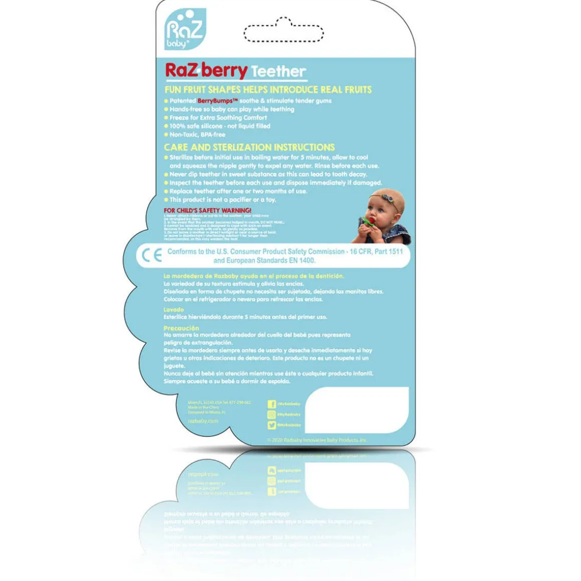 RaZbaby RaZberry Silicone Teether Toy is a stimulating, multi-textured pacifier used to soothe swollen gums and emerging teetct texh. Perfeture to chew. This hands-free all silicone teething pacifier can also be frozen for extra comfort. Simply place water in the Teether and freeze. In minutes you have the best cooling teething toy to soothe you newborns tender gums. RaZberry Teether is Non-toxic food grade silicone and is free of BPA, PVC, phthalates, lead and cadmium. All natural and environmentally friendly. Multi Texture Teething surfaces encourage baby teething and grabbing. The ring is texture for a full 360 degrees of teething relief. Conforms to USA Consumer Product Safety Commission requirements. Conforms to EU standards