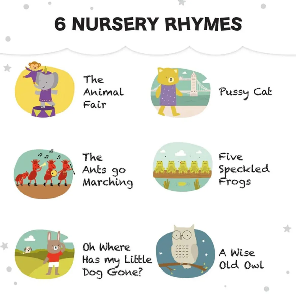 This book comes with a wonderful selection of six animal nursery rhymes that will have your little one singing, dancing, and clapping along! These action songs help enhance babies’ and toddlers’ language, comprehension, and motor skills!