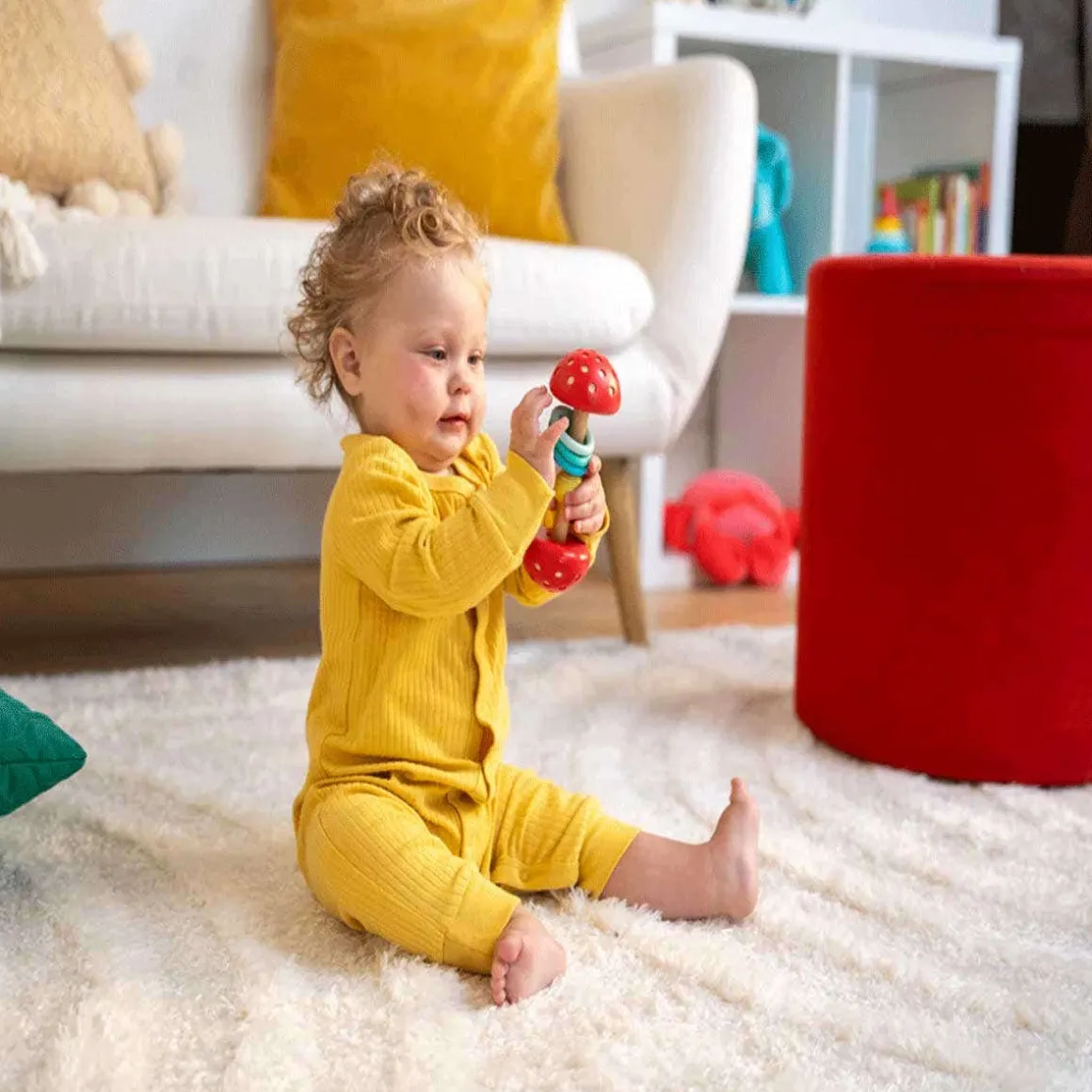 This touch-and-feel toy has plastic teething rings, a yellow textured bead, and internal rattle that is perfect for little hands. Satisfying curious hands and encouraging early teething is super easy with the Toadstool Twist & Shake baby toy. Produced with a beech wood dowel rod with securely fastened plastic ends, this easy-to-hold multicolor bar-bell shaped toy will keep kiddos busy during their earliest years. The plastic teething rings, yellow textured bead and internal rattle encourage cause and effect learning while providing auditory and sensory stimulation.