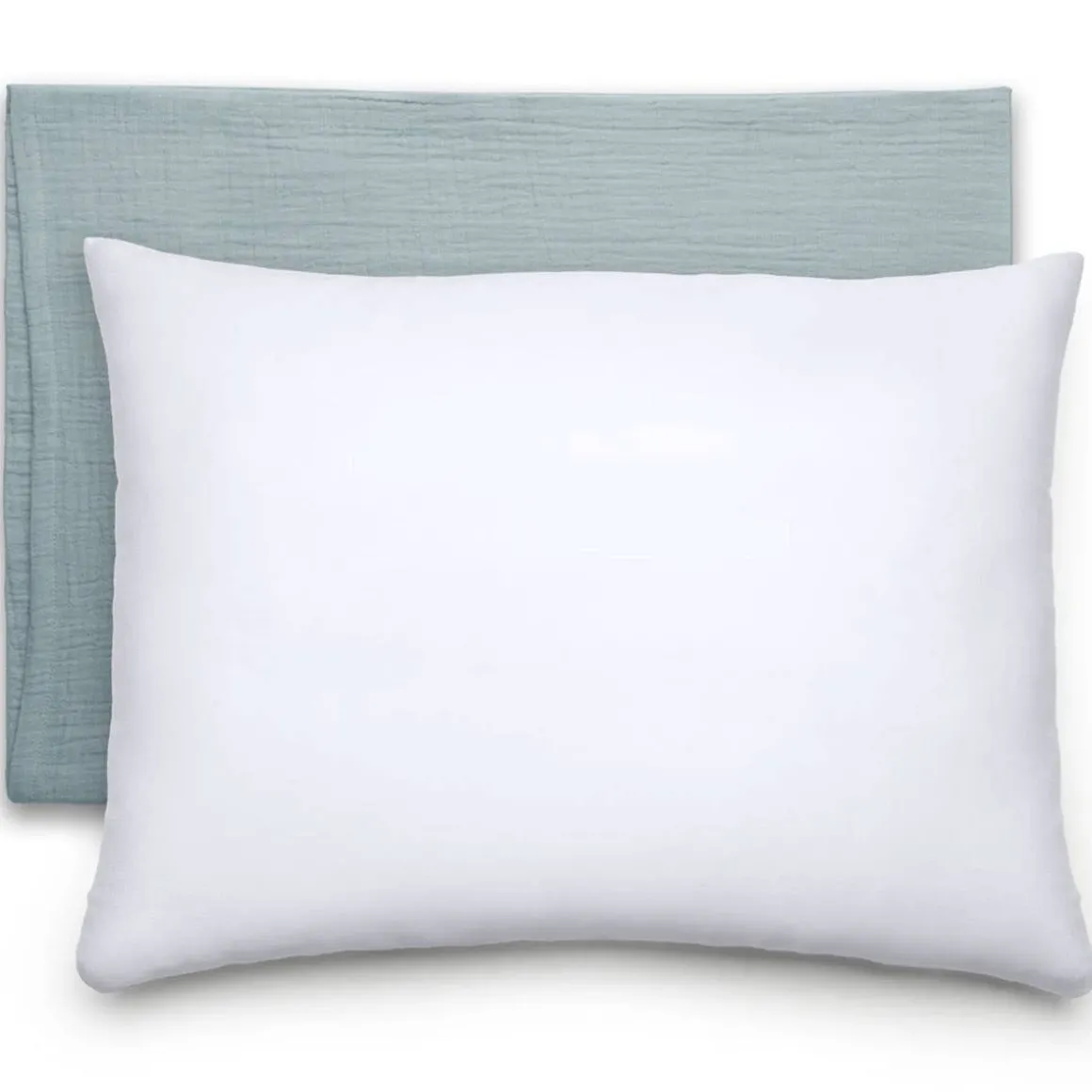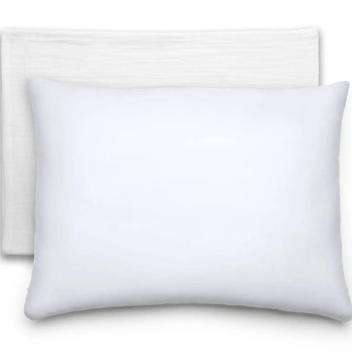 The Comfy Cubs toddler pillow with muslin pillowcase offers soft, breathable comfort and ergonomic support for your toddler’s neck and spine, with durable, machine-washable muslin that stays soft wash after wash.