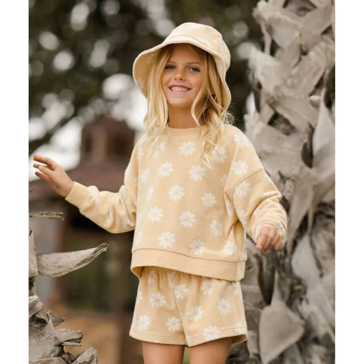 The terry daisy boxy pullover pair for a complete look. Featuring the ‘terry daisy’ all over print on yellow. These bright white daisies stand out on their yellow terry backgrounds to make the perfect statement piece for bold little ones.