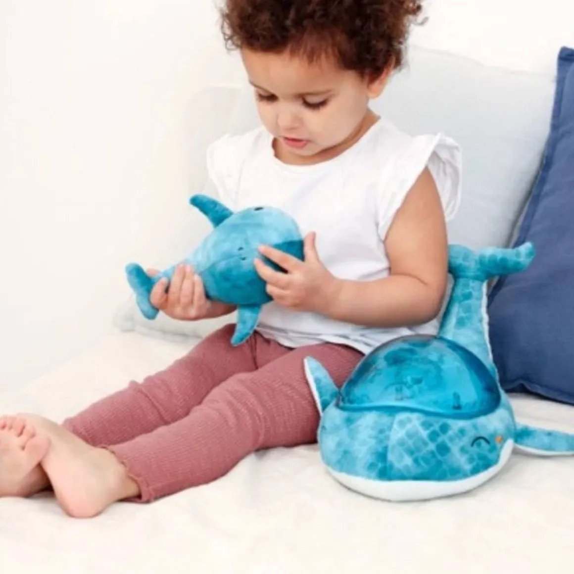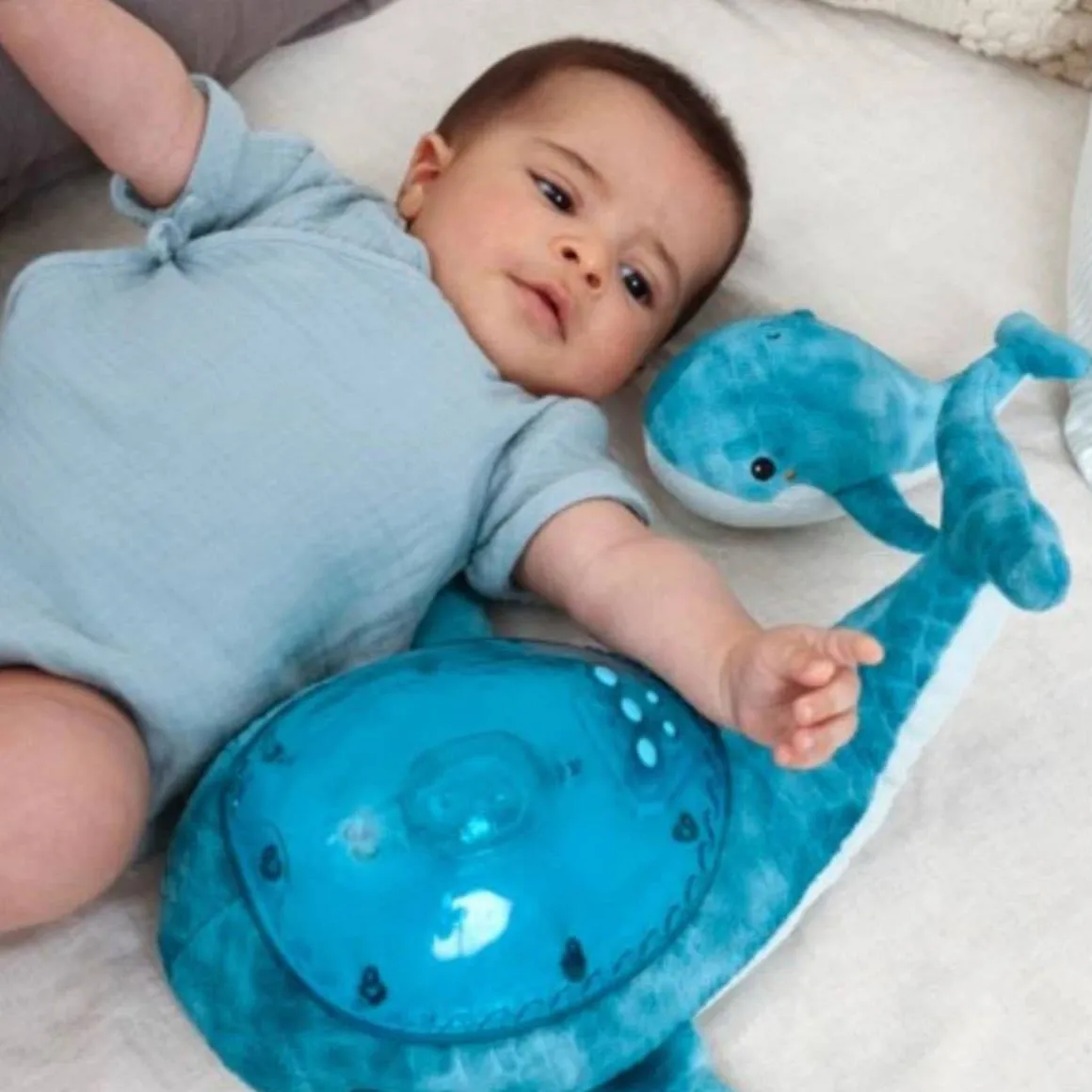 The Tranquil Whale ® Bundle comes with a Tranquil Whale and a Baby Whale. The Tranquil Whale is a cloud-shaped soother that projects a calming blue glow and Plays gentle whale sounds to help your little one drift off to sleep. The Baby Whale is a smaller, cloud-shaped soother that projects a calming blue glow. It’s perfect for your little one to take on the go. Both soothers are BPA-free and play for up to 30 minutes.