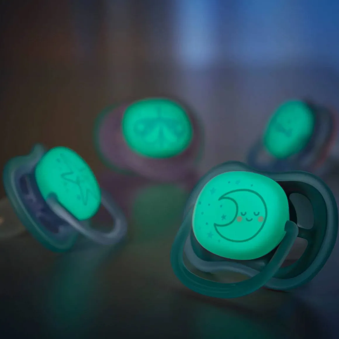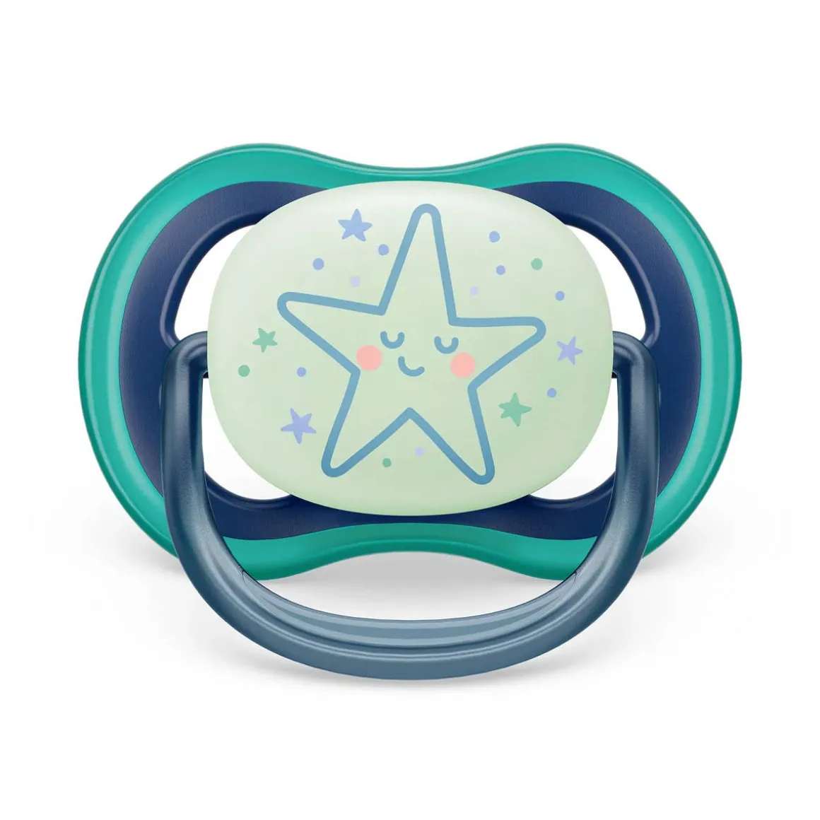 The Philips Avent Ultra Air pacifier for babies 6-18 months has a long lasting glow, so it’s easy to find in the dark. It’s designed with a lightweight, breathable shield for baby’s sensitive skin. Four (4) extra large holes in the shield allow for maximum air flow, so skin stays drier while soothing; 84% of moms agree!* 98% of babies accept the nipple**, so you can feel confident with this choice. Comes with 2 pacifiers packaged in a sterilizer / carrying case that can be used to sterilize them with water in the microwave and transport them. *MetrixLab Home Placement Test with 118 U.S. moms, 2017 **98% of moms say their babies accept the textured nipple in our ultra air and ultra soft pacifiers, independent research, USA, 2016 – 2017