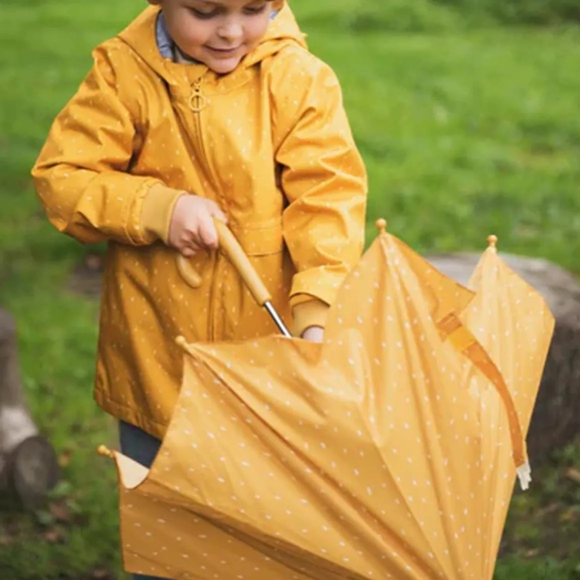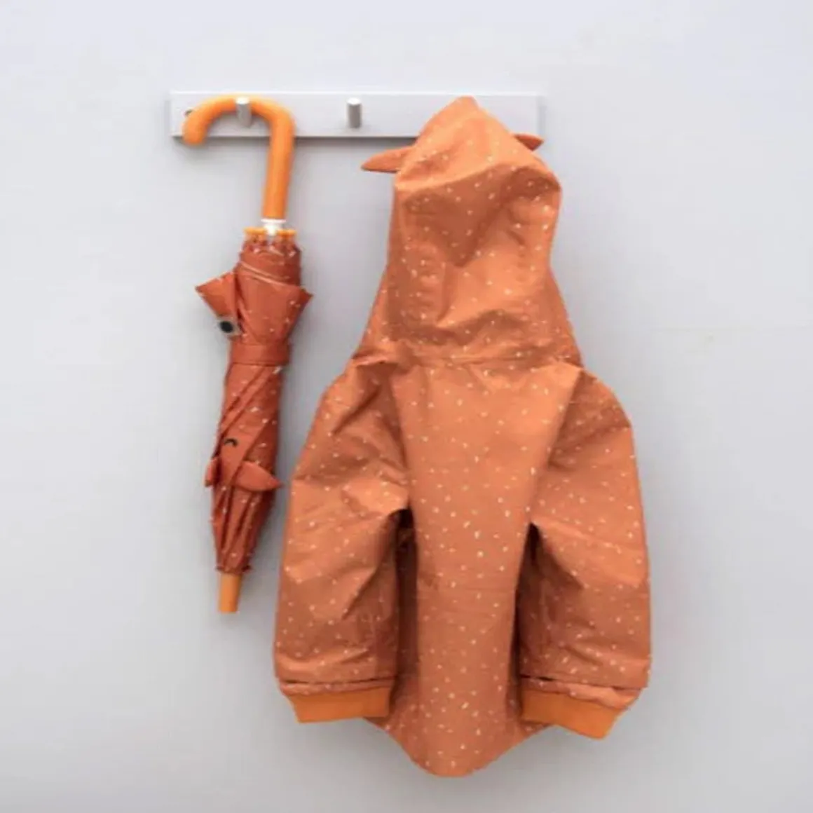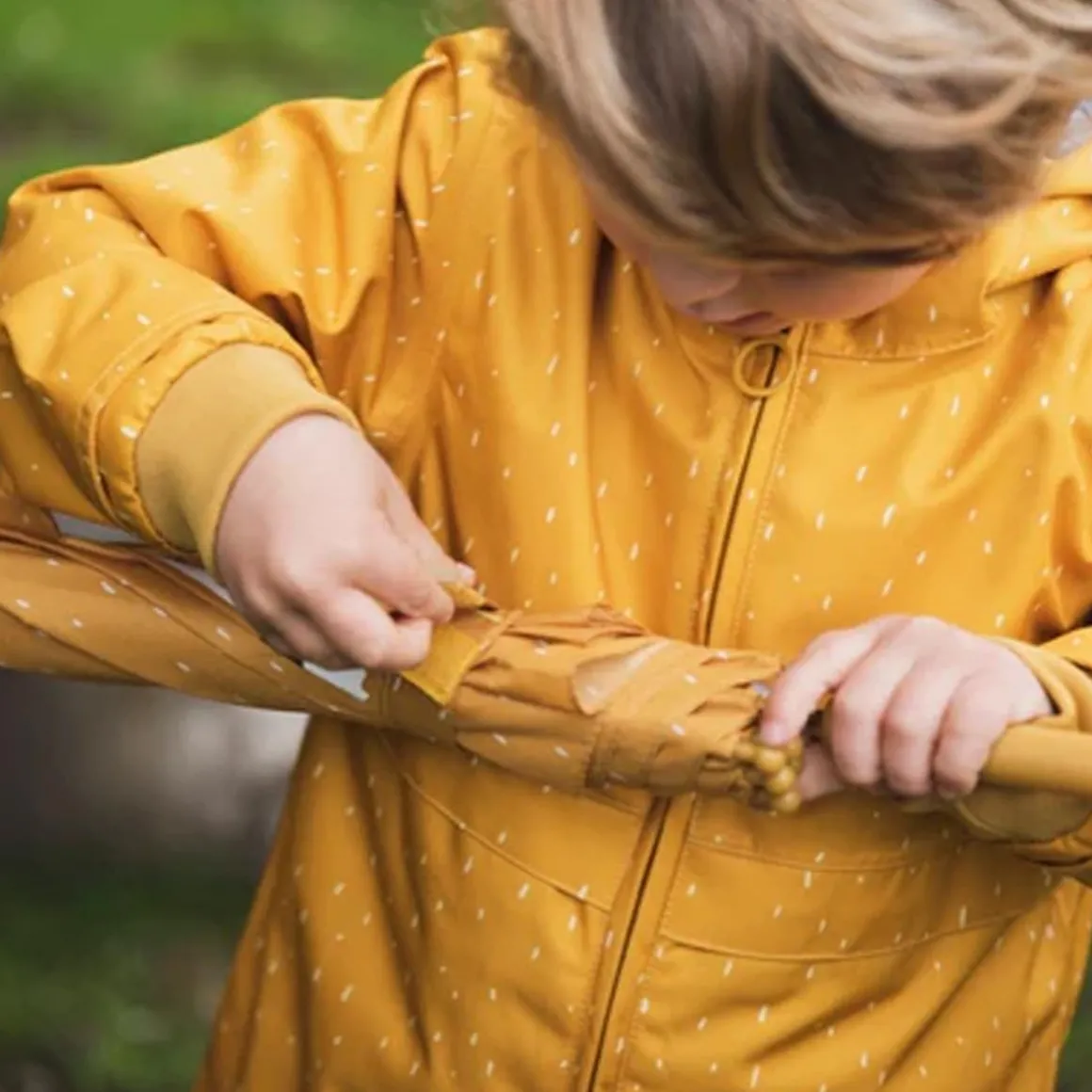 Let’s go sing in the rain with animal umbrellas, made out of recycled fabric! Instantly brighten up grey days with our smiling animal faces to keep your little one dry! When it rains this cheerful umbrella will brighten things up. You can choose between Mr. Polar Bear, Mr. Fox, Mrs. Elephant, Mrs. Rabbit, Mr. Monkey, Mr. Crocodile & Mr. Lion. Their floppy ears will cheerfully bounce around while your little one is jumping in the rain puddles! The umbrella is made of 100% recycled polyester. The safe sliding system to open and close the umbrella is especially designed for little fingers. The umbrella has a strong, high quality and lightweight aluminium frame. The little strap with animal tail allows you to neatly store the umbrella when the sun is shining.