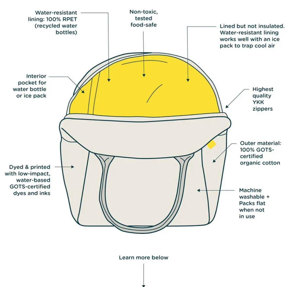 Deceptively roomy lunch bag that packs flat for easy storage. Made from durable GOTS-certified organic cotton with a rinseable, food-safe lining to contain light spills. The interior pocket is perfect for a water bottle or ice pack. Fully machine washable, non-toxic, and ethically handmade with organic and recycled materials.