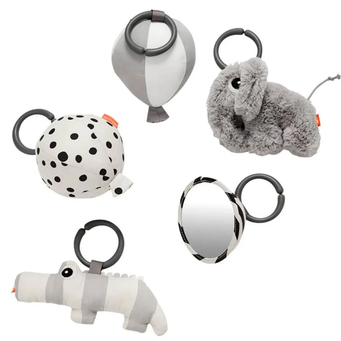 Hang the toys in 13 different positions on the arches. Croco will crackle when touched, Elphee rattles, the little mirror will smile back and the balloons contains chime and a bell – all for your baby’s stimulation.