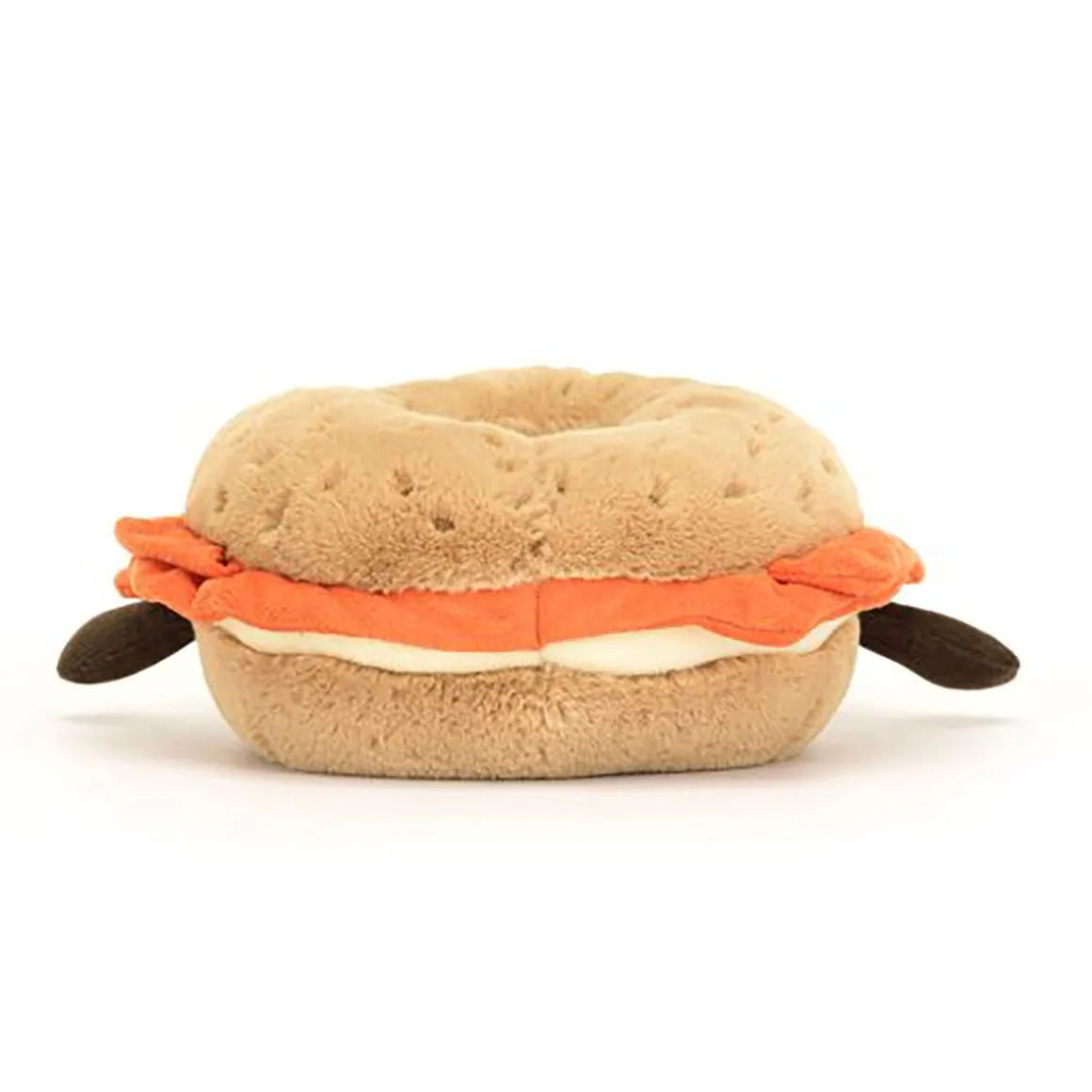 Amuseables Bagel is dressed for brunch, with soft golden bread stitched with sesame freckles, a dollop of suedette cream cheese and an orange layer of suedette salmon. With dark brown cord arms and a chilled stitch smile, this bagel is always fresh!