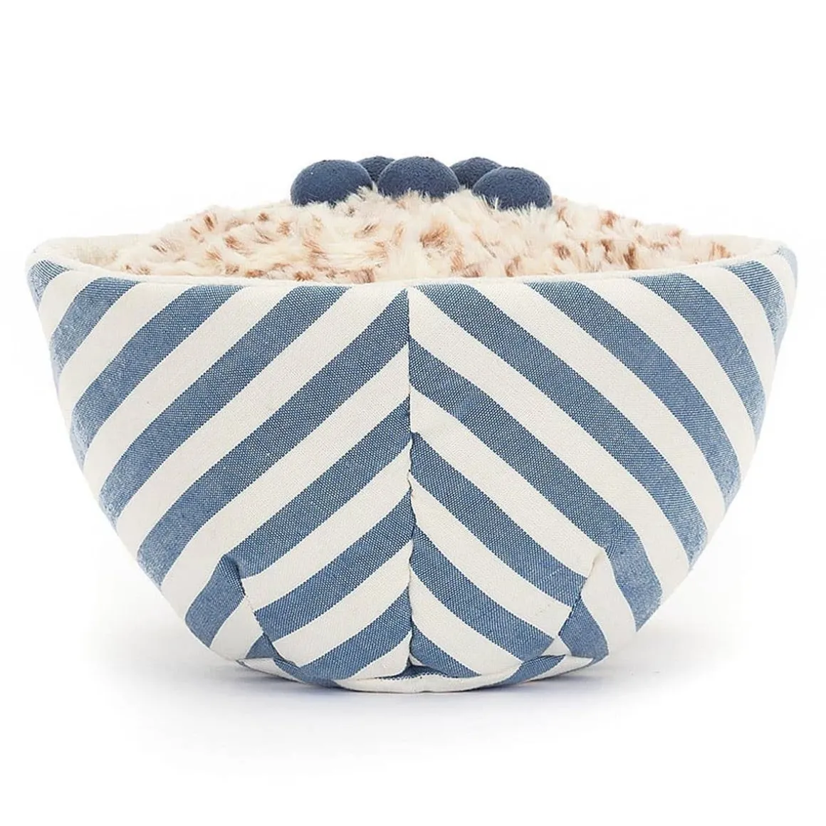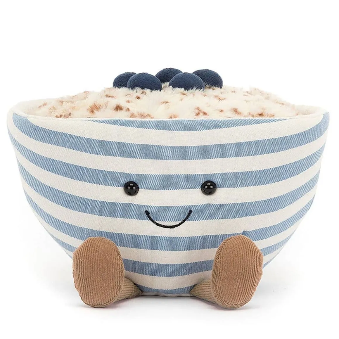 Talk about wholesome fun! Amuseable Oats is a smiley cotton bowl, striped in blue and cream, with a suedette rim and almond cord boots. Full to the brim with golden-brown oatmeal and topped with plump blueberries, they’ll help you start the day off right!
