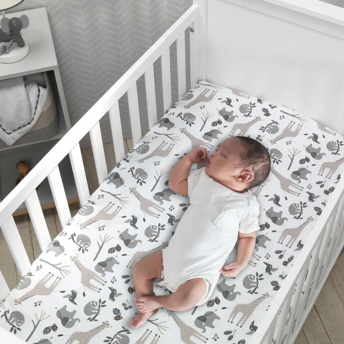 This action packed 100% cotton fitted crib sheet features giraffes, elephants, toucans, sloths and small trees and branches on a crisp white ground.