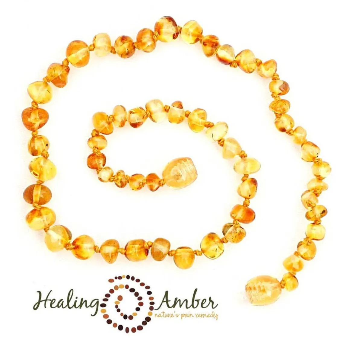 Baltic Amber is a fossilized tree resin and comes in a variety of shapes and colours. Baltic Amber is made for wearing (not chewing or ingestion). Amber contains succinic acid, a natural analgesic and healing agent. Amber will warm against your body and the succinic acid will be absorbed through your skin helping with pain relief.